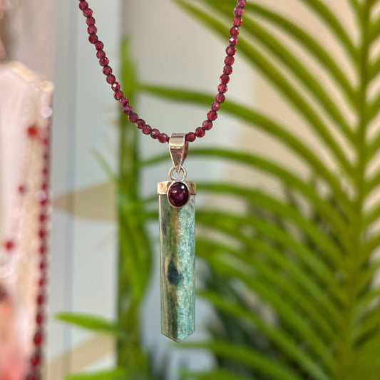 Unique Sterling Silver Green Kyanite and Ruby Pendant and a Garnet Beaded Necklace