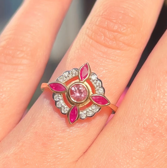 Edwardian Reproduction 9ct Yellow Gold Pink Tourmaline Ruby and Diamond Ring - Size O