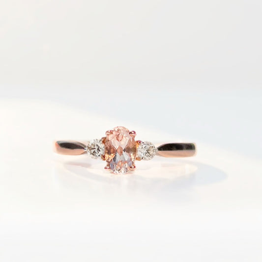 Sweet 9ct Rose Gold Morganite and Diamond Trilogy Ring - Size M ½
