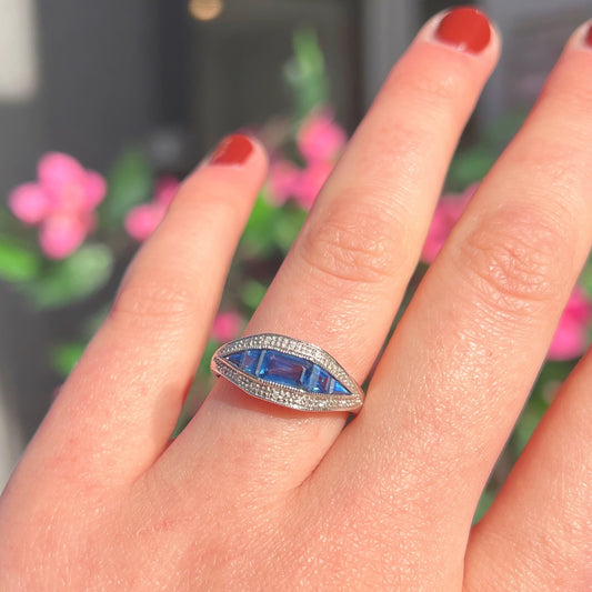 Art Deco Reproduction 9ct White Gold Madagascar Blue Sapphire and Diamond Ring - Size O
