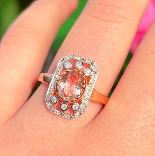 Art Deco Inspired 9ct Rose Gold Morganite and Diamond Ring – Size N ½