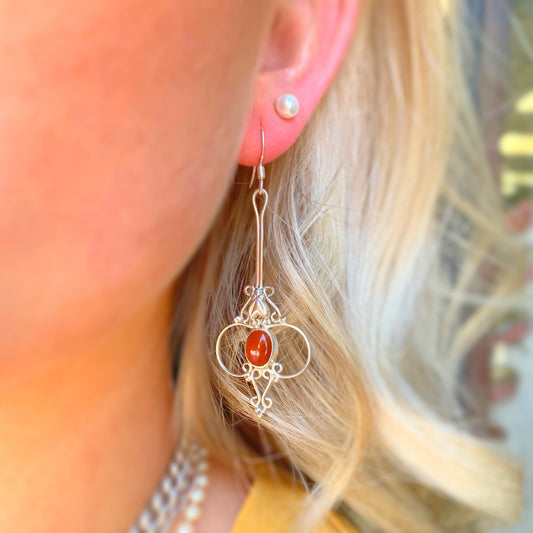 Intricate Filigree Sterling Silver Carnelian Drop Earrings