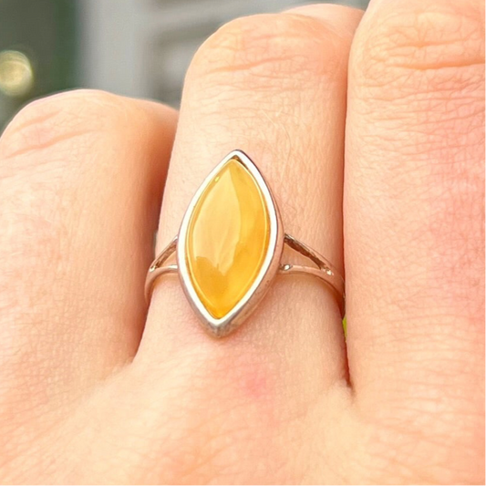 Sterling Silver Yellow Butterscotch Amber Marquise Cut Ring