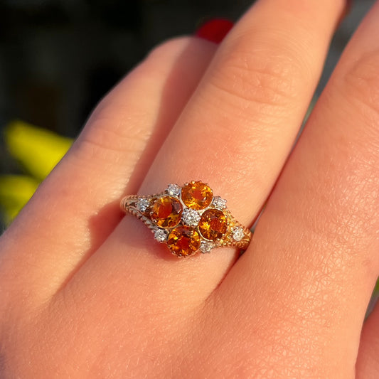 Victorian Inspired 9ct Yellow Gold Citrine and Diamond Forget-me-not Ring - Size M ½