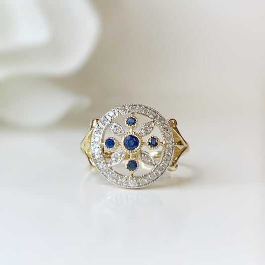 Victorian Inspired 9ct Yellow Gold Sapphire and Diamond Ring – Size L ½