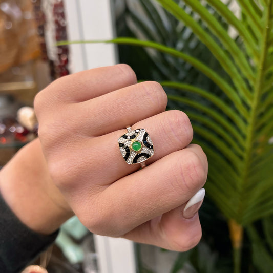 9ct Yellow Gold Jade, Onyx and Diamond Art Deco Reproduction Ring - Size O