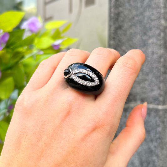 XXL Chunky Sterling Silver Black Onyx & Cubic Zirconia Design Ring - Size Q