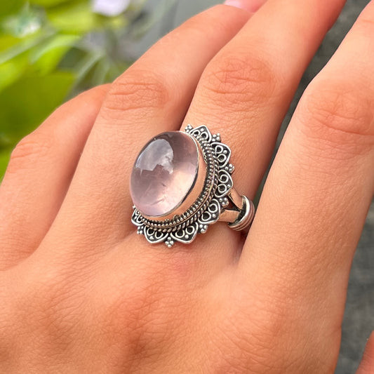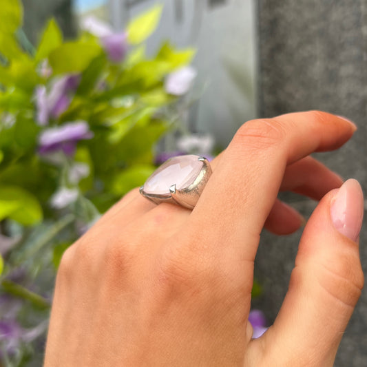 Chunky Bohemian Sterling Silver Cabochon Pink Rose Quartz Ring - Size N