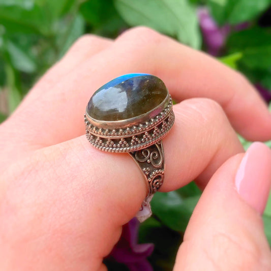 Chunky Boho Sterling Silver Oval Blue Labradorite Ring - Size O ½