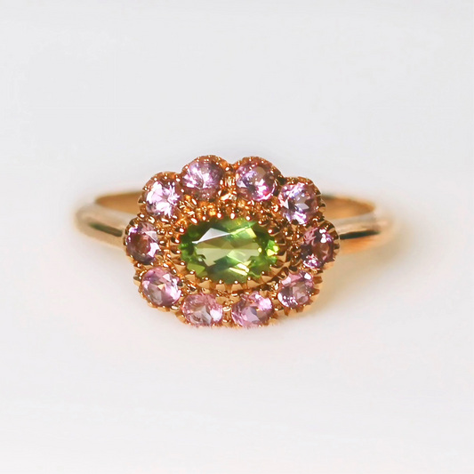 ‘Arabella’ Victorian Reproduction 9ct Yellow Gold Peridot and Pink Tourmaline Floral Inspired Ring - Size O