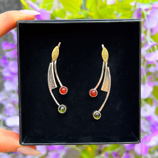 Unique Rustic Sterling Silver Peridot & Carnelian Drop Earrings