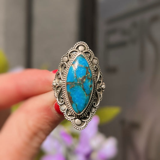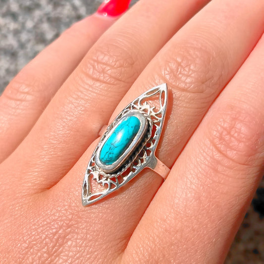 Elongated Sterling Silver Turquoise Filigree Ring - Size M ½