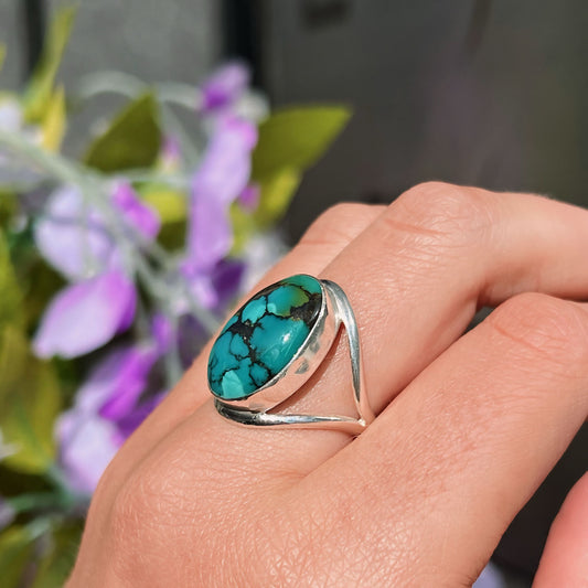 Statement Bohemian Inspired Sterling Silver Marquise Turquoise Ring - Size N ½
