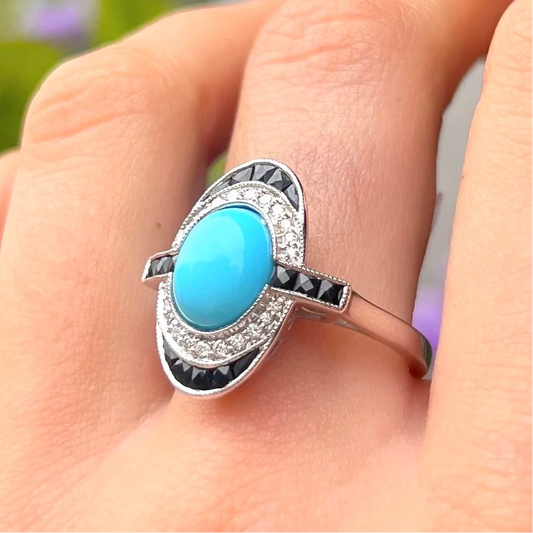 18ct Yellow Gold Turquoise, Onyx and Diamond Ring - Size O