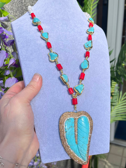 18ct Yellow Gold Plated Chunky Red Coral & Blue Turquoise Maximalist Statement Beaded Leaf Necklace