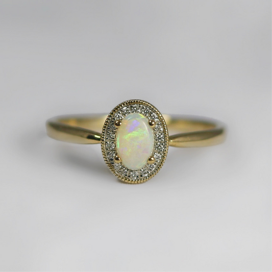 Sweet Feminine 9ct Yellow Gold Oval Opal and Diamond Halo Ring - Size O