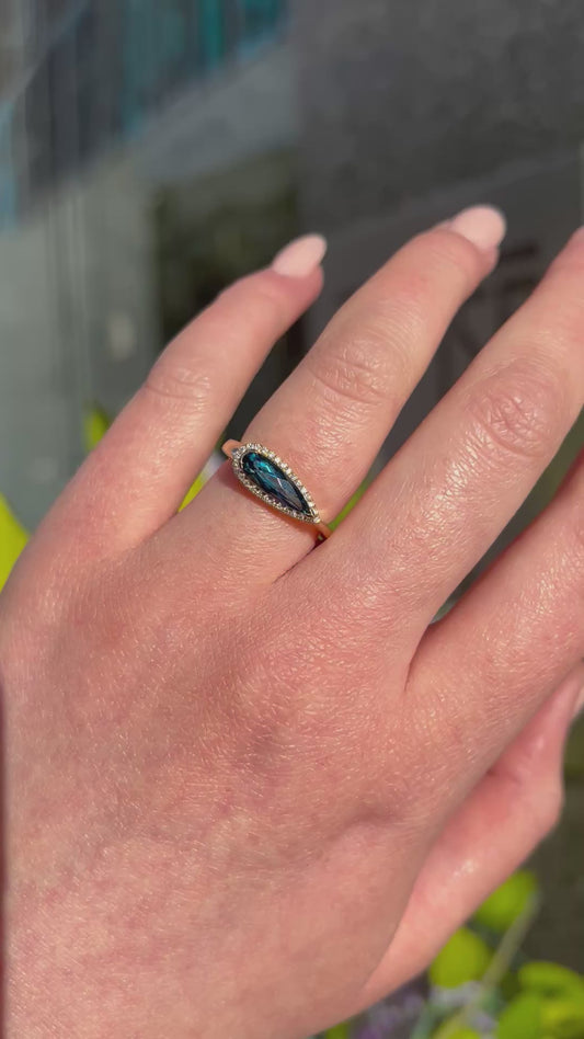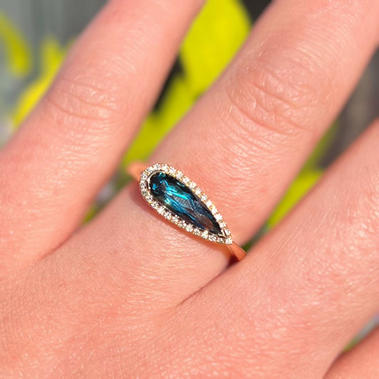 The Cinderelle Ring - Abstract 9ct Gold London Blue Topaz and Diamond Landscape Pear Size M ½