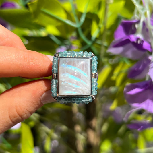 Bohemian Square Rainbow Moonstone & Aquamarine Beaded Ring - Adjustable