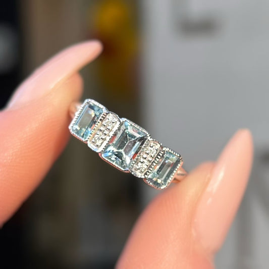 Vintage Inspired 9ct White Gold Aquamarine and Diamond Trilogy Ring - Size P