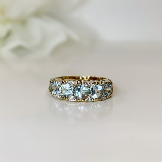 Edwardian Inspired 9ct Yellow Gold Aquamarine and Diamond Ring- SIZE M