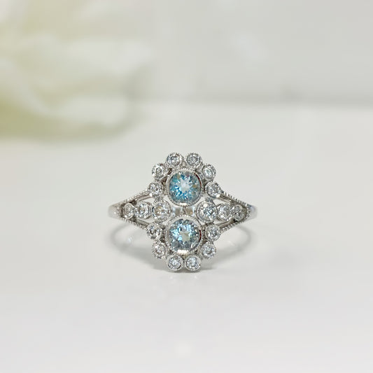 Edwardian Inspired 18ct White Gold Aquamarine and Diamond Ring - Size N ½