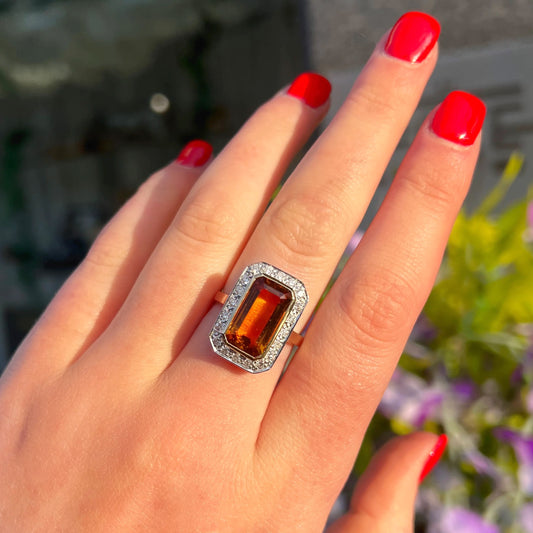 Art Deco Inspired 9ct Yellow Gold Madeira Citrine and Diamond Halo Cocktail Ring - Size N ½