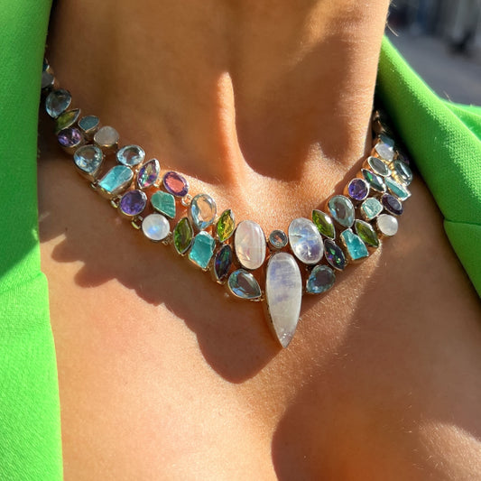 Rainbow Moonstone, Amethst, Aquamarine, Peridot & Mystic Topaz Chunky Sterling Silver Statement Necklace