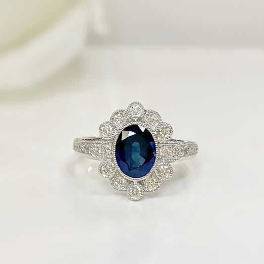 Art Deco Inspired Platinum Sapphire and Diamond Engagement Ring – Size N