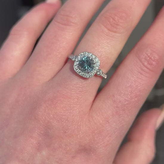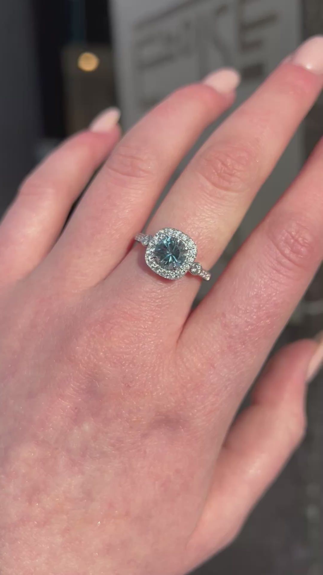 Securely claw-set at the centre, this captivating gem is encircled by a dazzling diamond halo, with larger round diamonds adorning each shoulder in milgrain-finished bezel settings. This thoughtful detail adds depth and beautifully frames the central design.