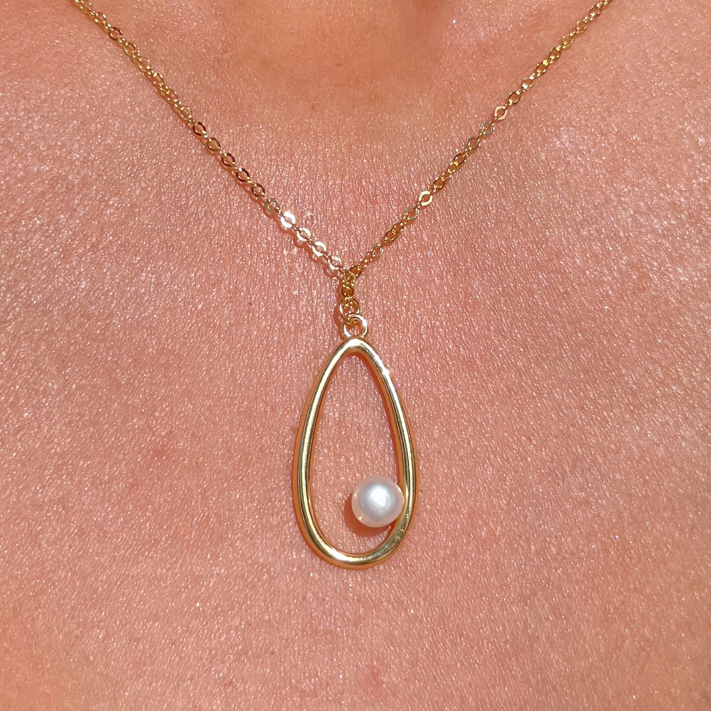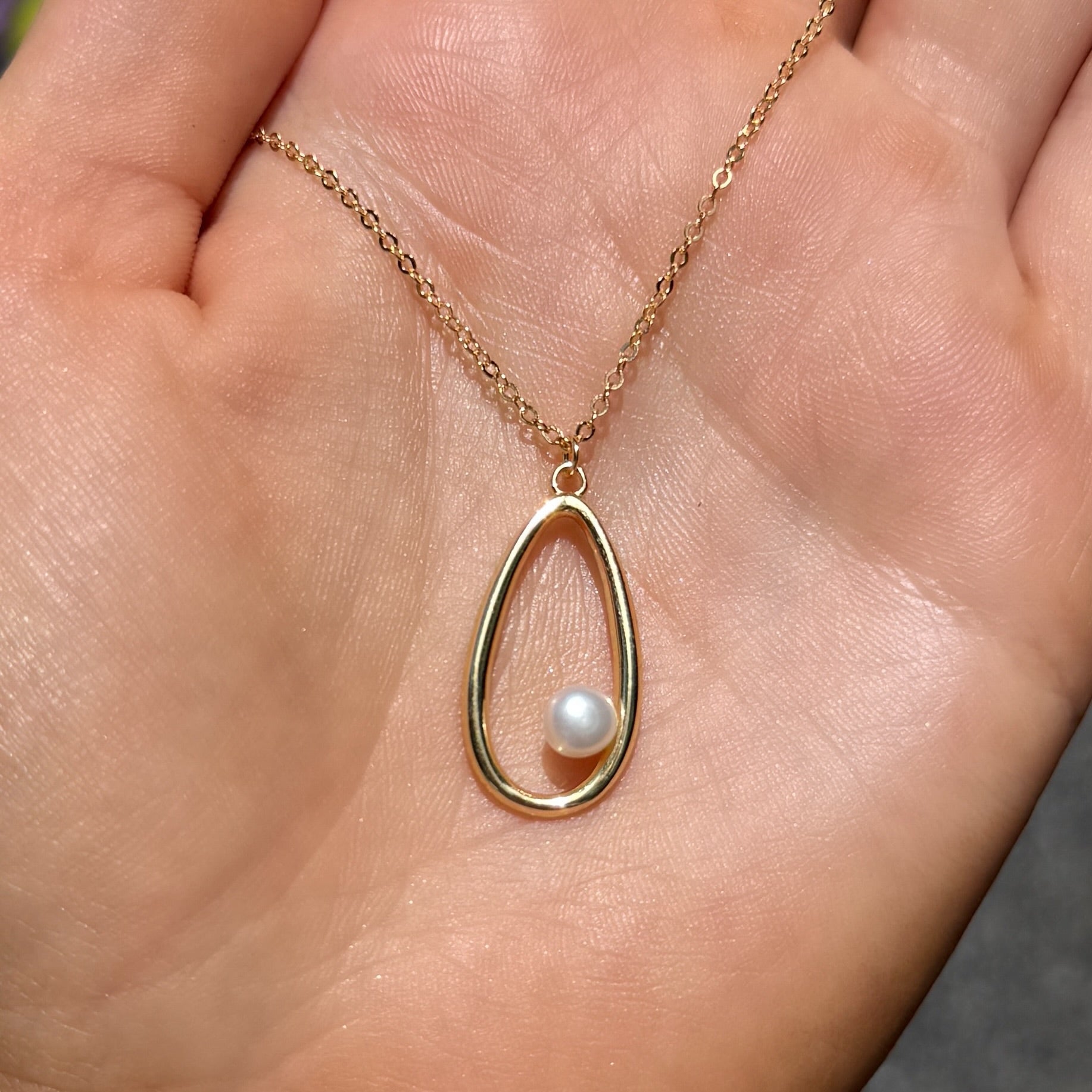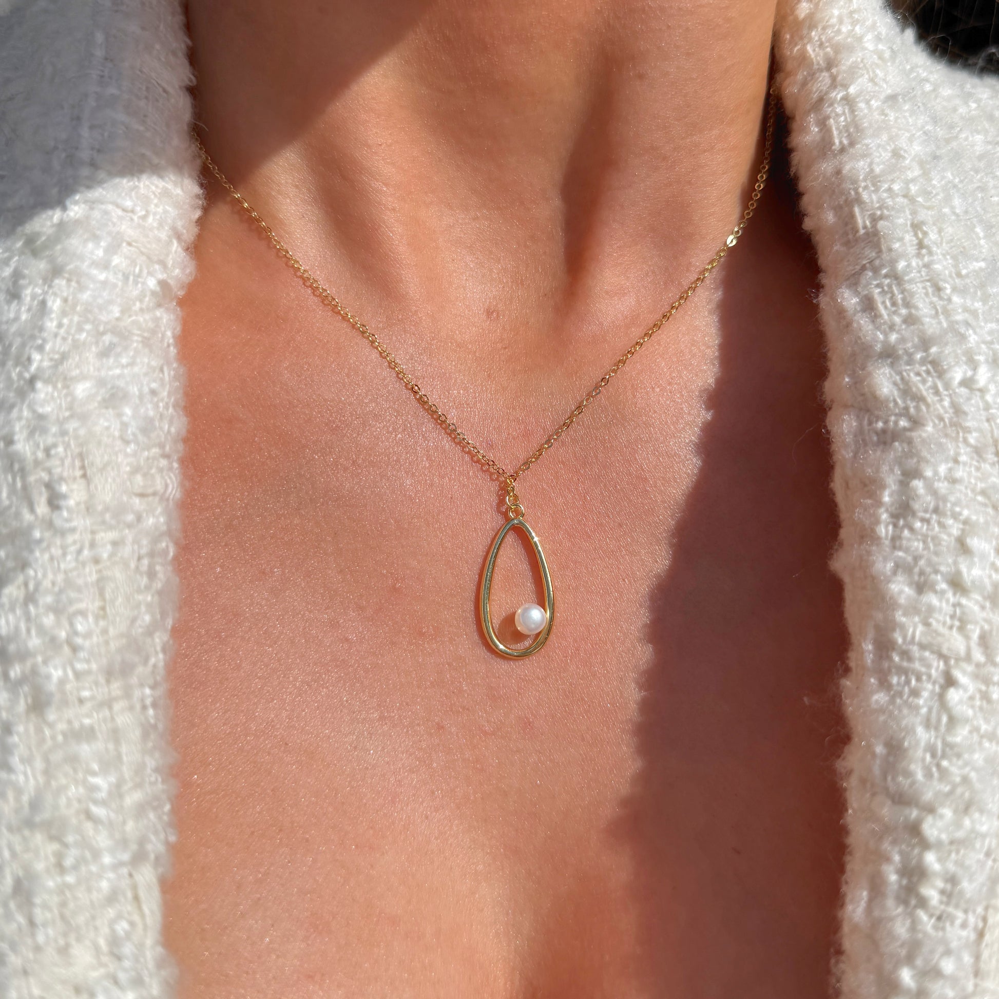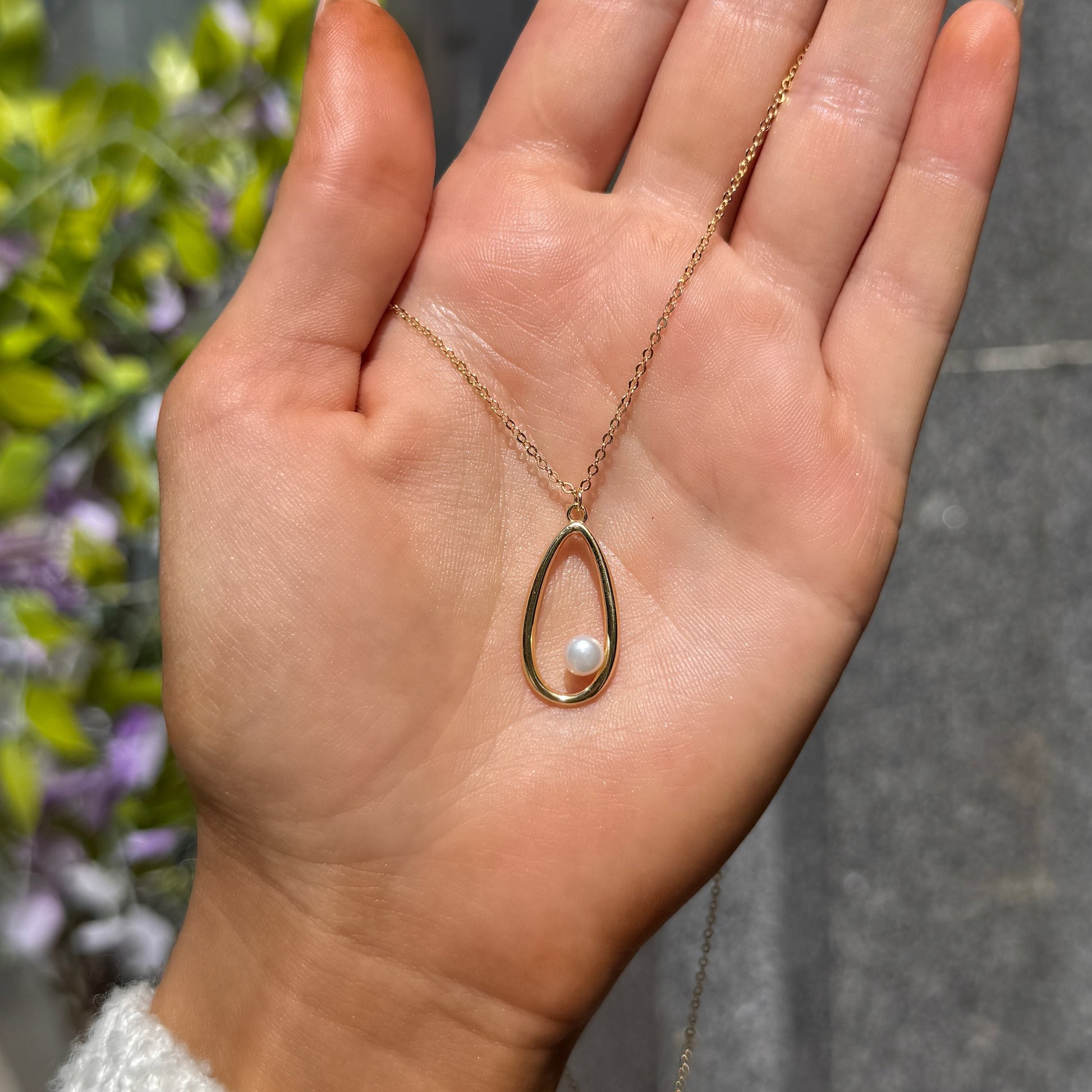 The perfect trendy necklace! This dainty necklace features one real bright white freshwater pearl in a 9ct gold plated sterling silver design.