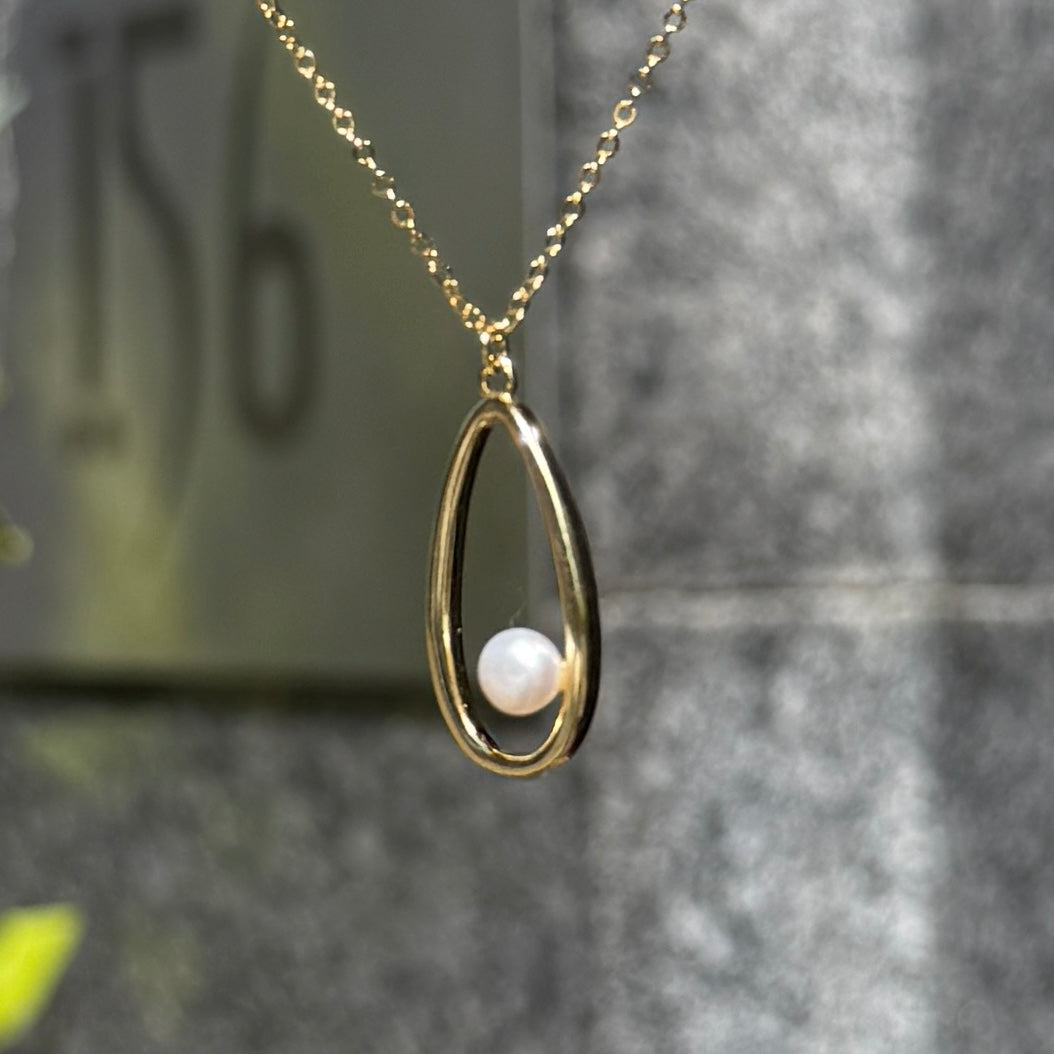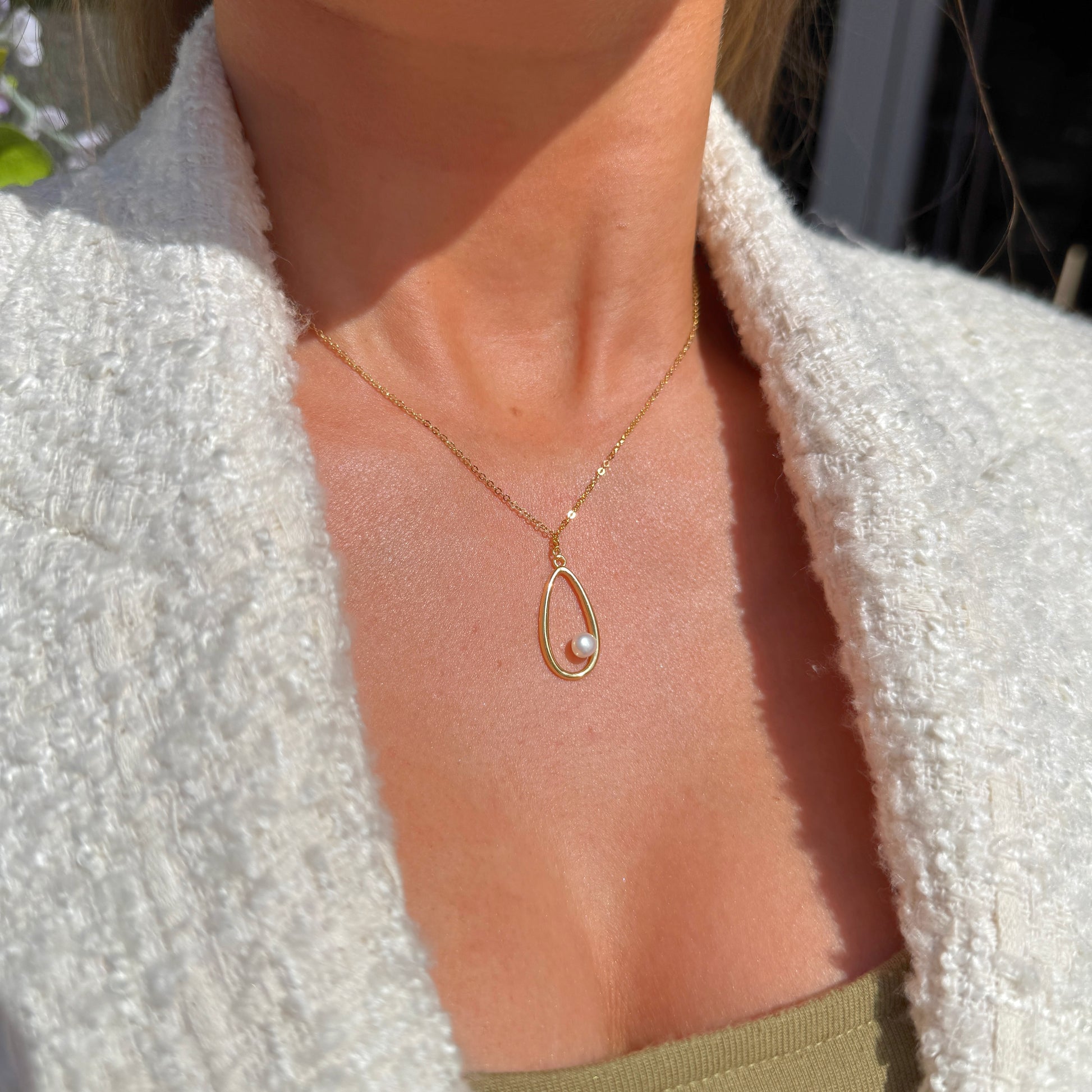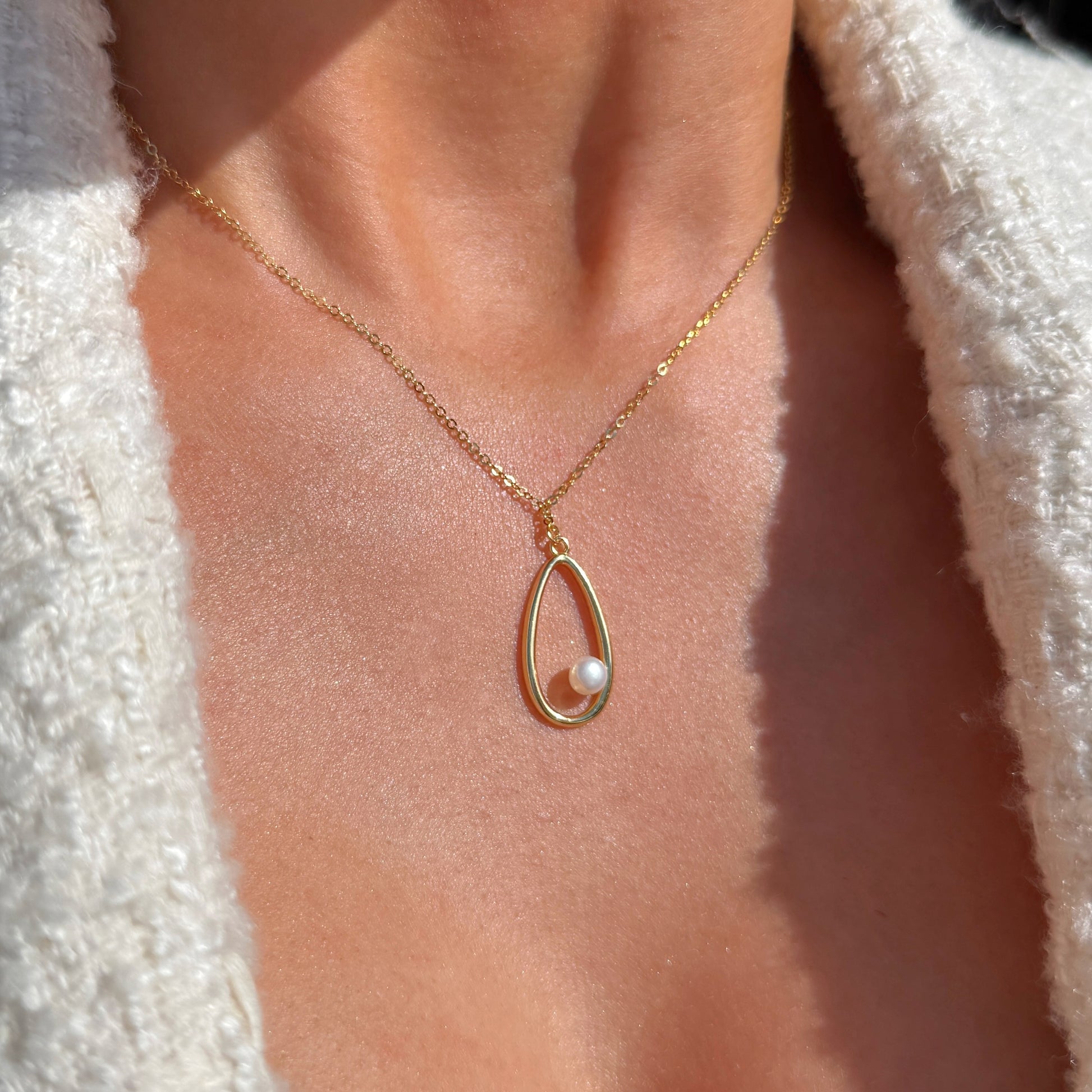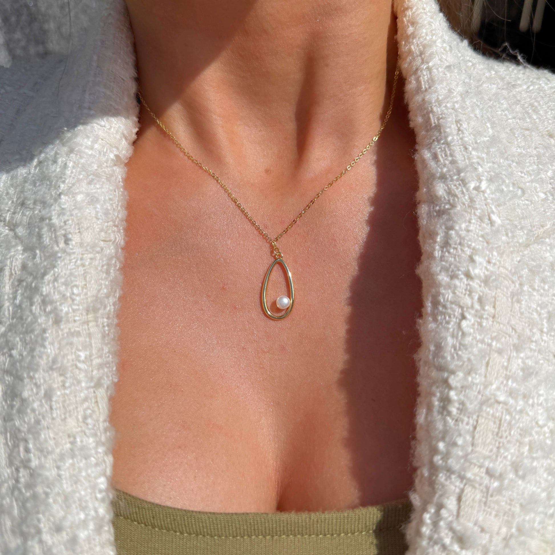 The perfect trendy necklace! This dainty necklace features one real bright white freshwater pearl in a 9ct gold plated sterling silver design.