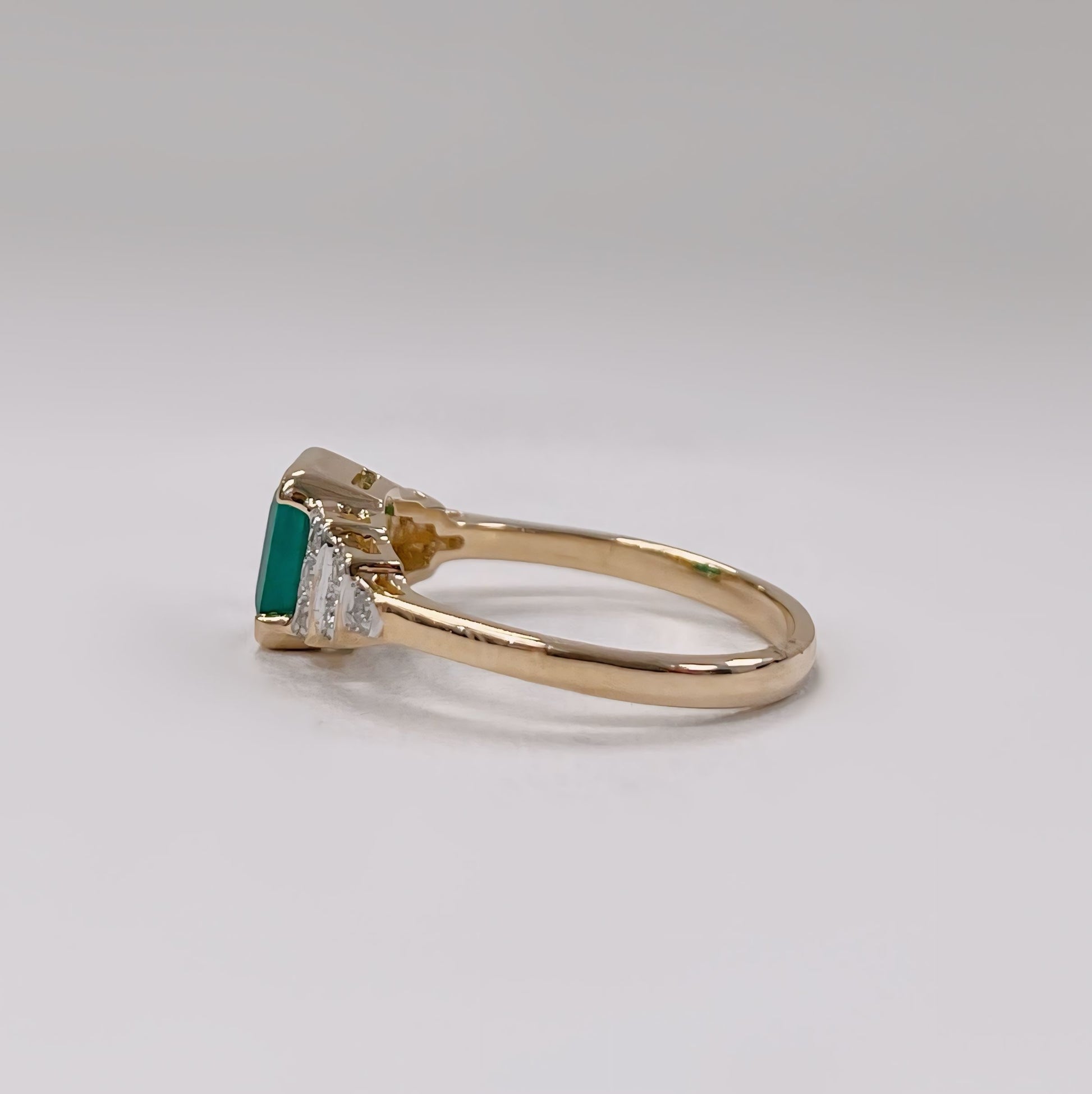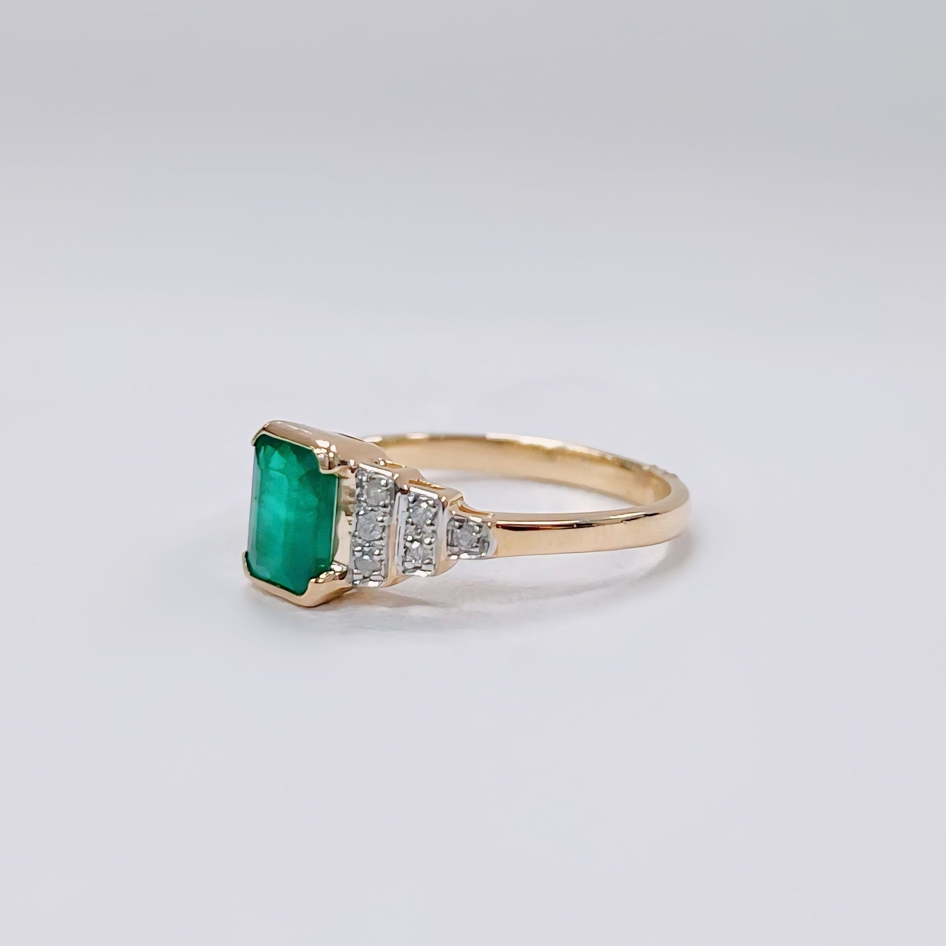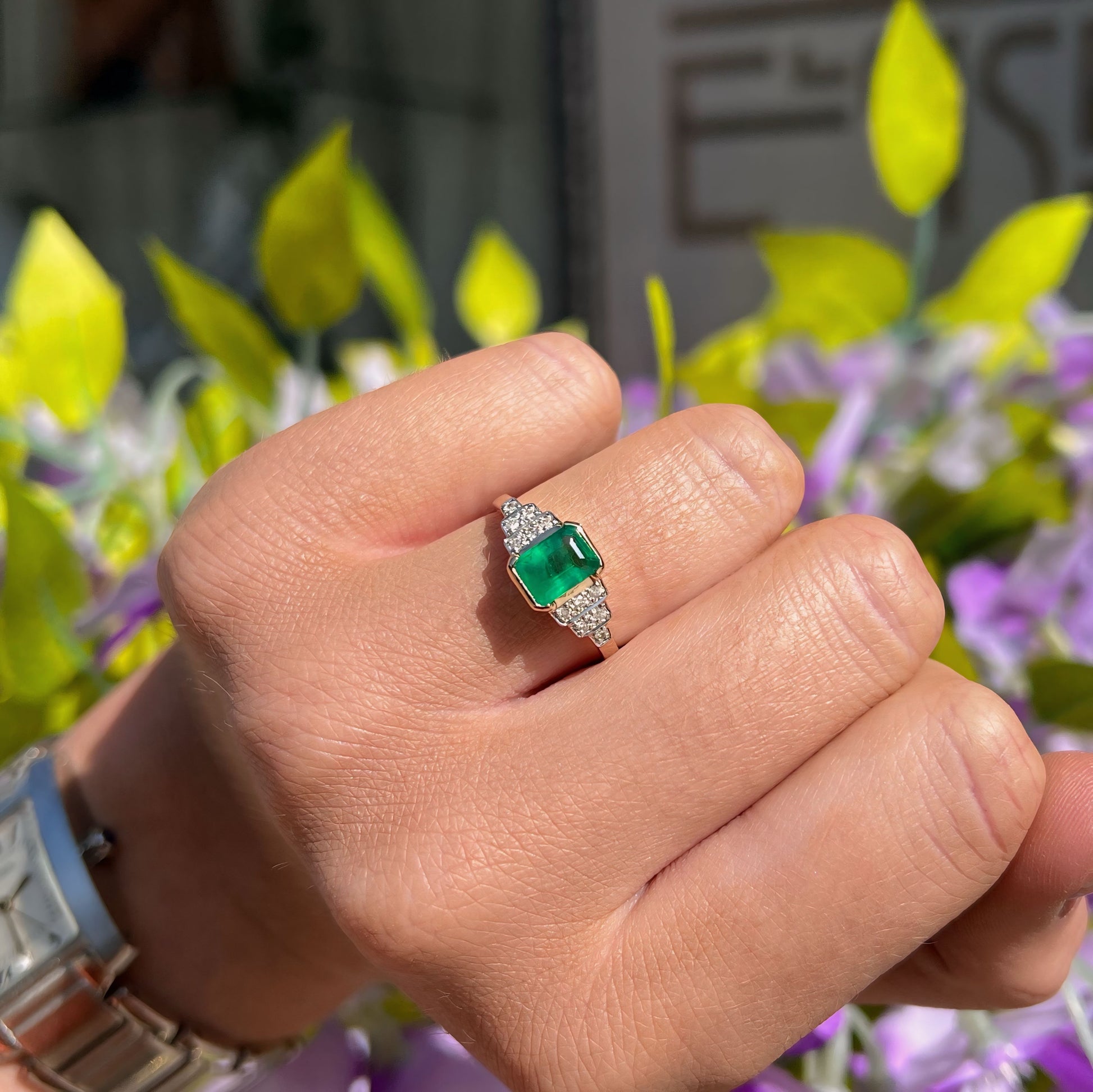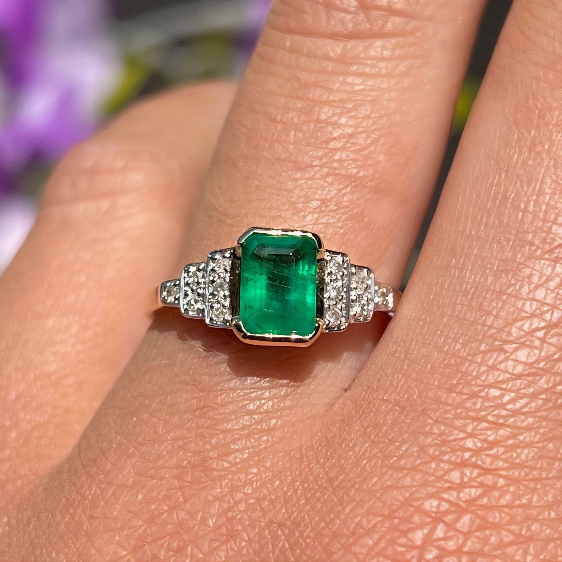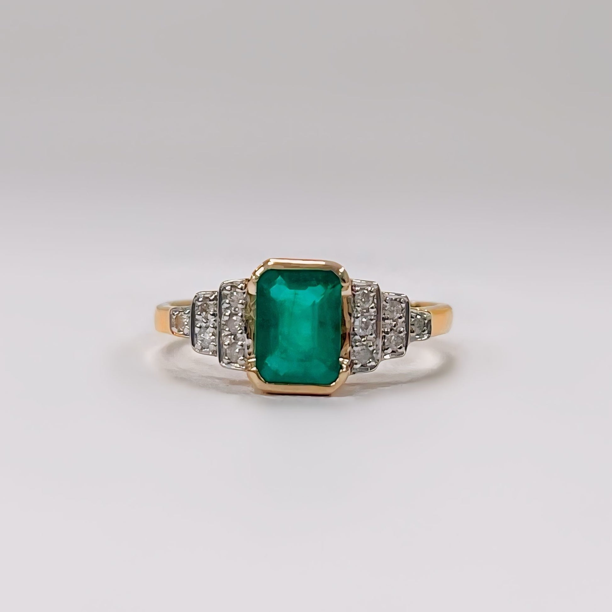 This ring boasts a strong Art Deco influence. Crafted in timeless 9ct yellow gold, it showcases a vibrant green emerald, half-bezel set into the centre of the design. Flanking the centre stone are brilliant-cut diamonds set into a classic 1920s rhodium-plated stepped design for added depth.