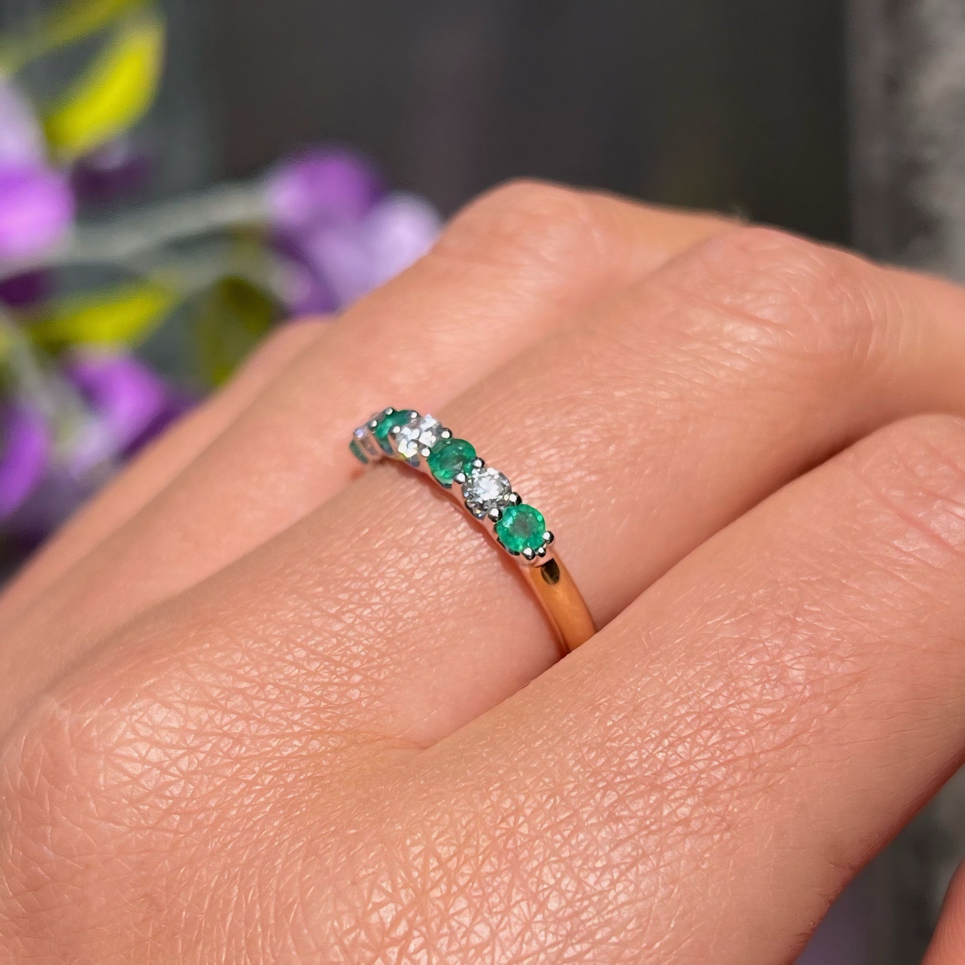 Crafted in 9ct yellow gold, this seven-stone ring features three sparkling brilliant-cut diamonds and four glowing green emeralds expertly set into a timeless eternity ring design.