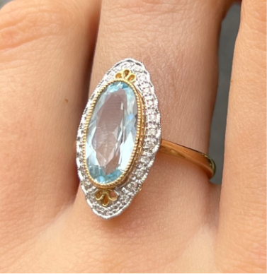 This really is the most perfect ring. It features an oval cut blue topaz in the centre haloed by diamonds and set in buttery 9ct gold.
