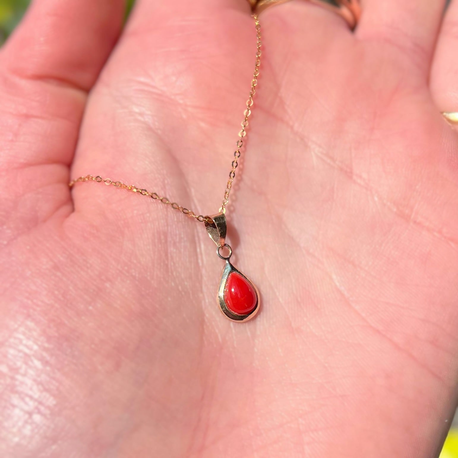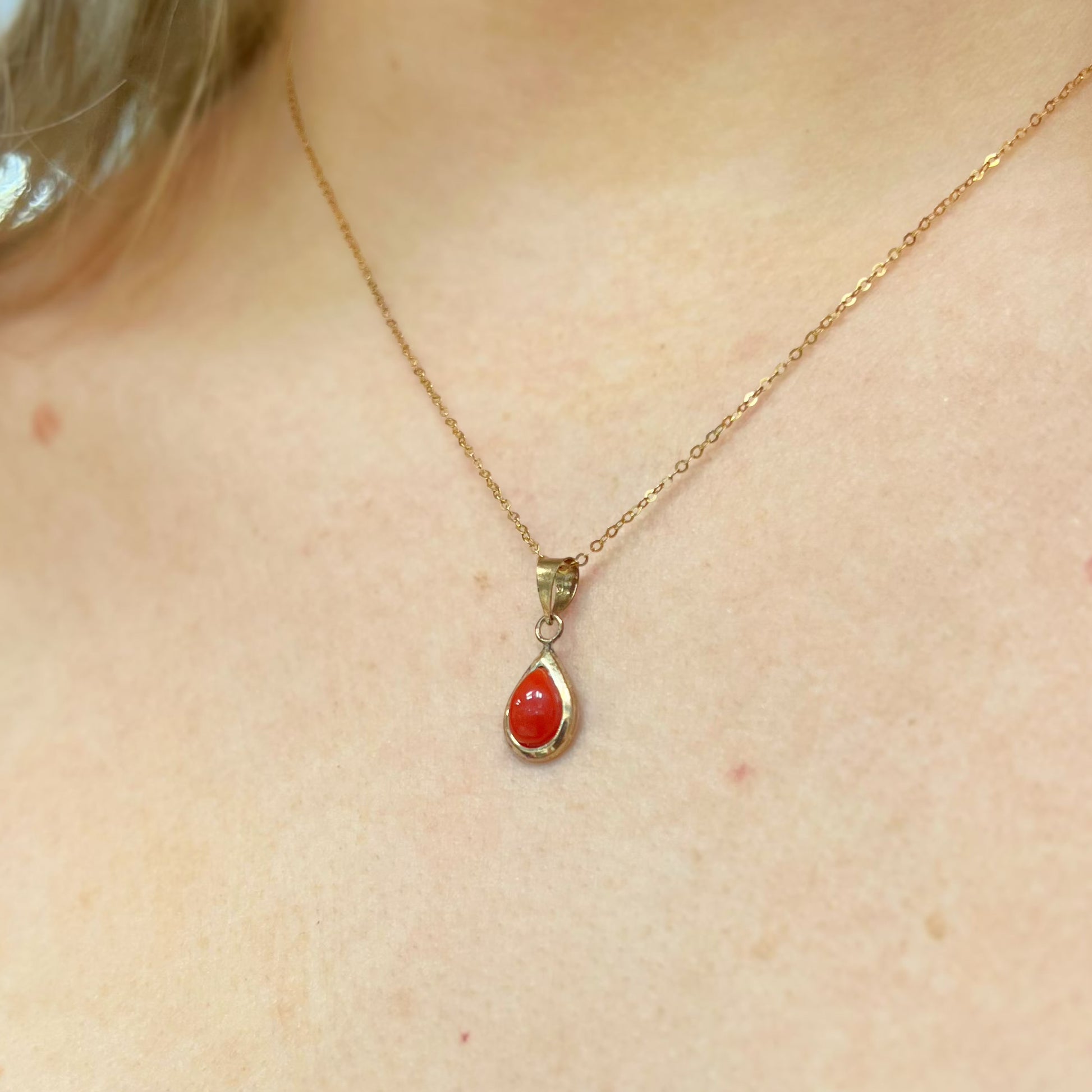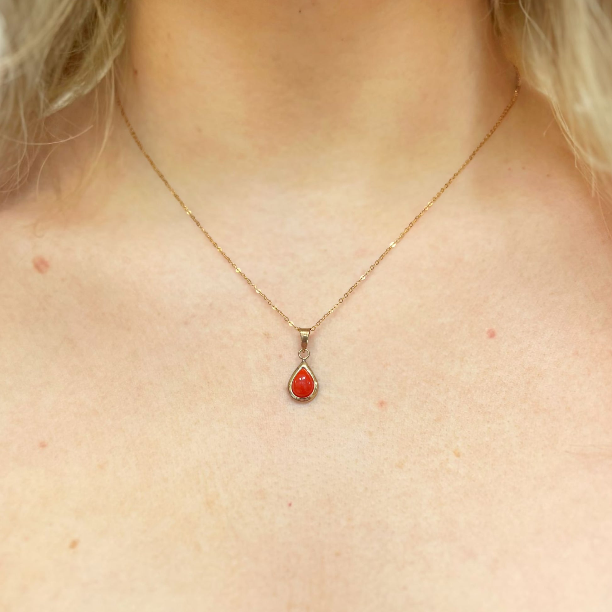 Rare and Timeless 9ct Yellow Gold Dainty Pear Shaped Coral Necklace