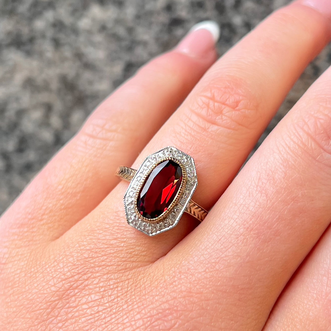 The Anna Ring - Art Deco Inspired 9ct Yellow Gold, Red Garnet and Diamond Ring Size L ½