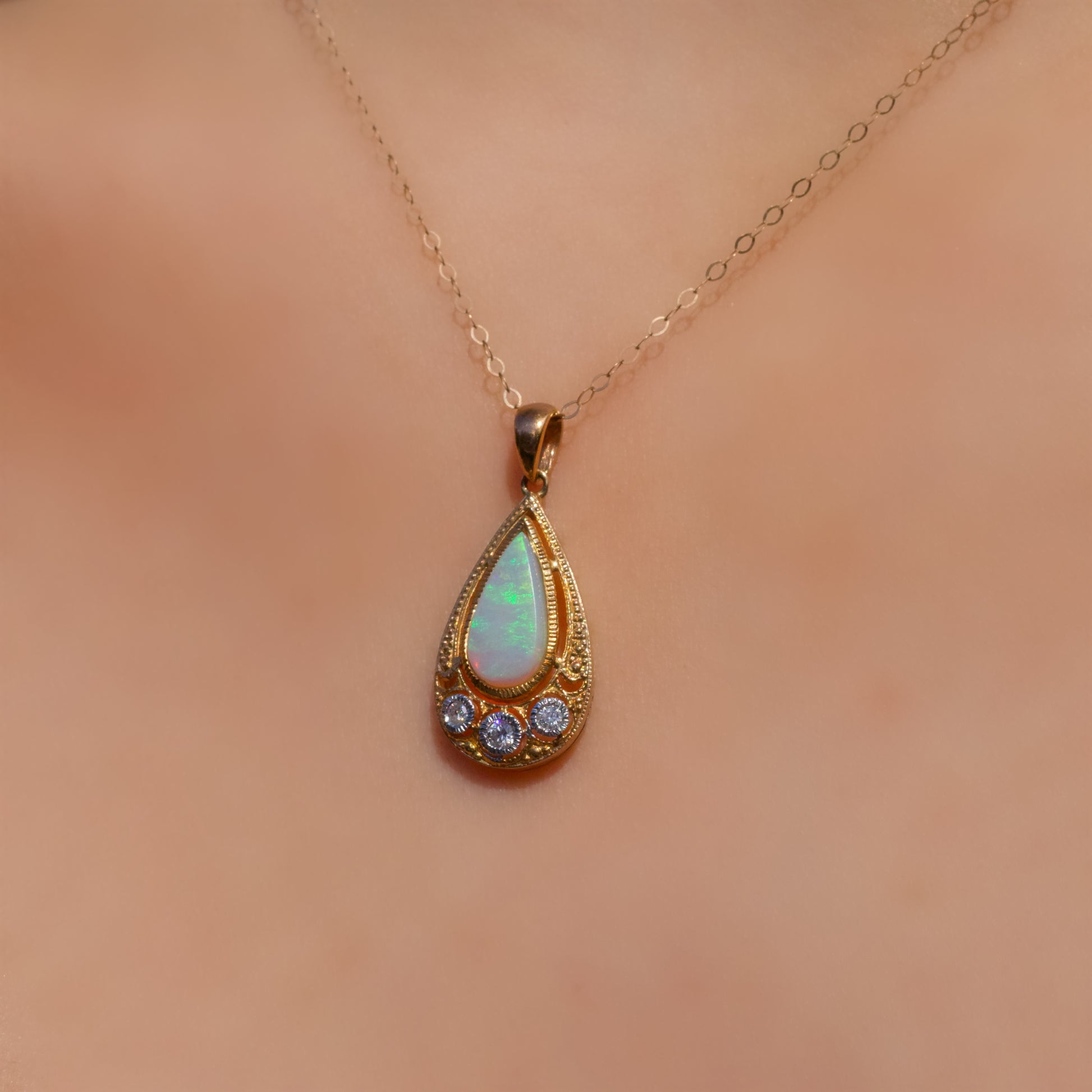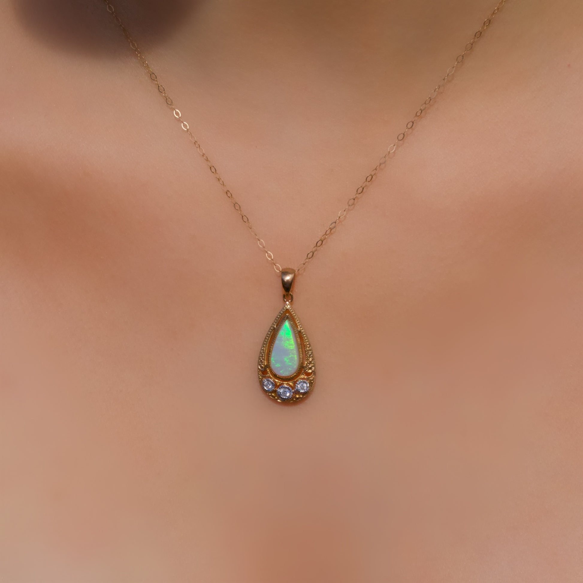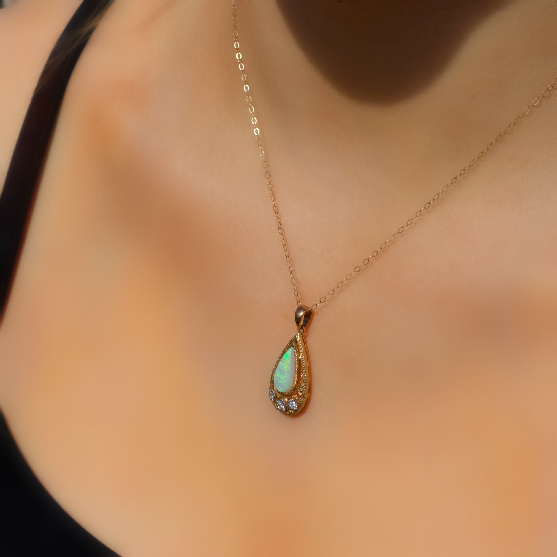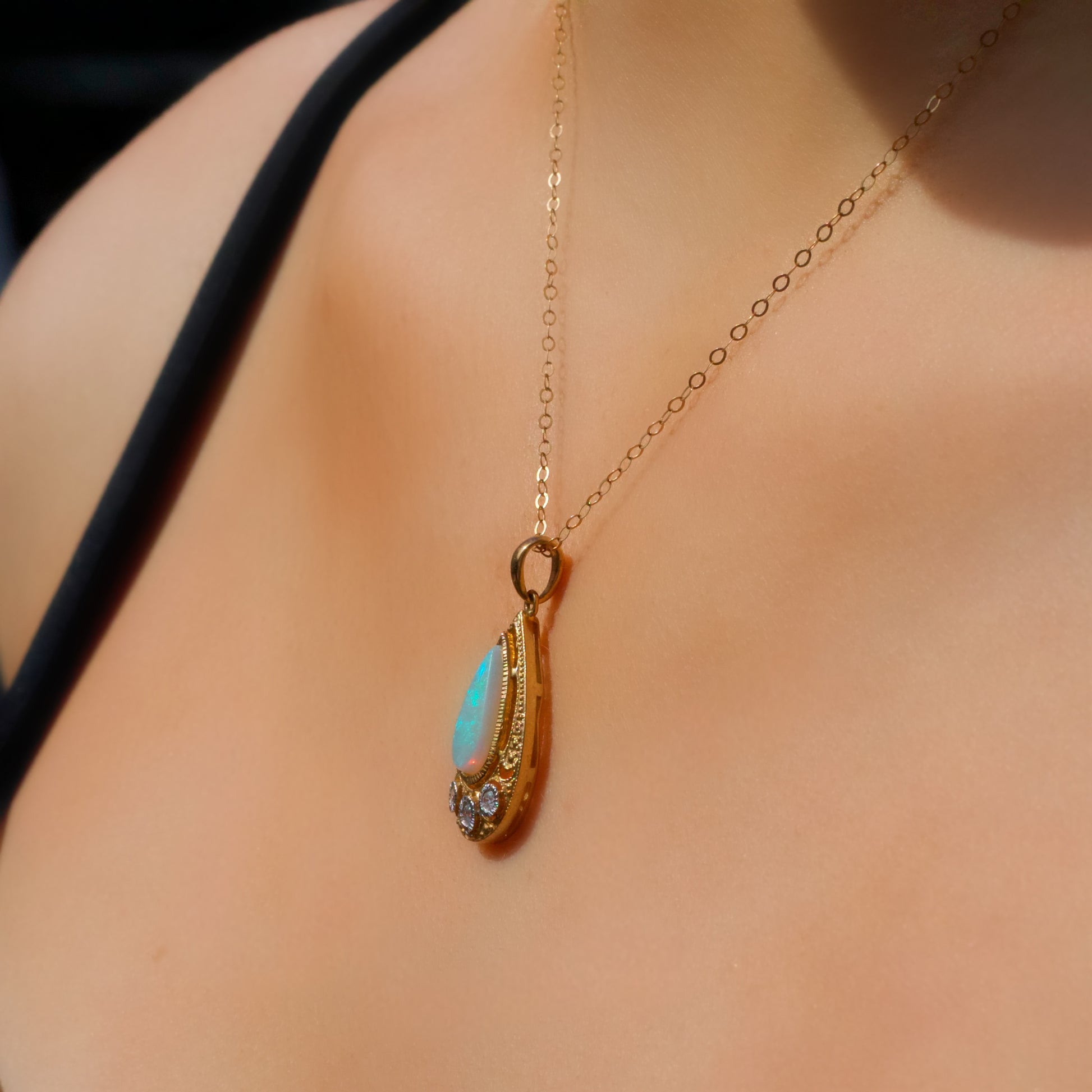 This mesmerising necklace features a pear cut, milky opal bezel set into the centre of the pendant.