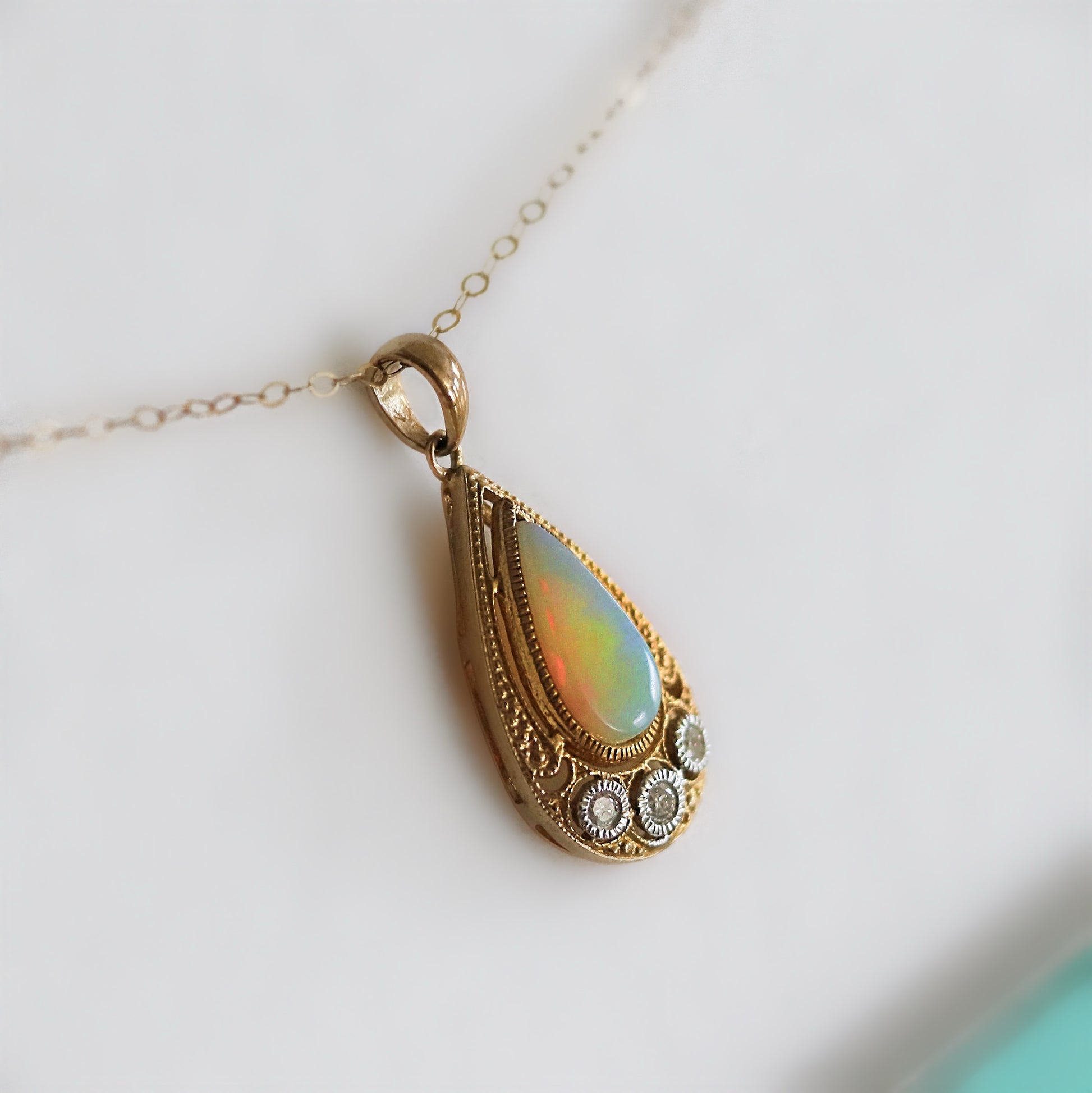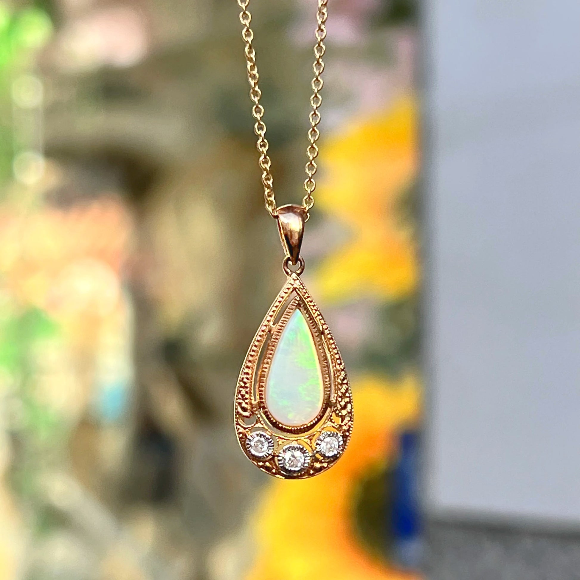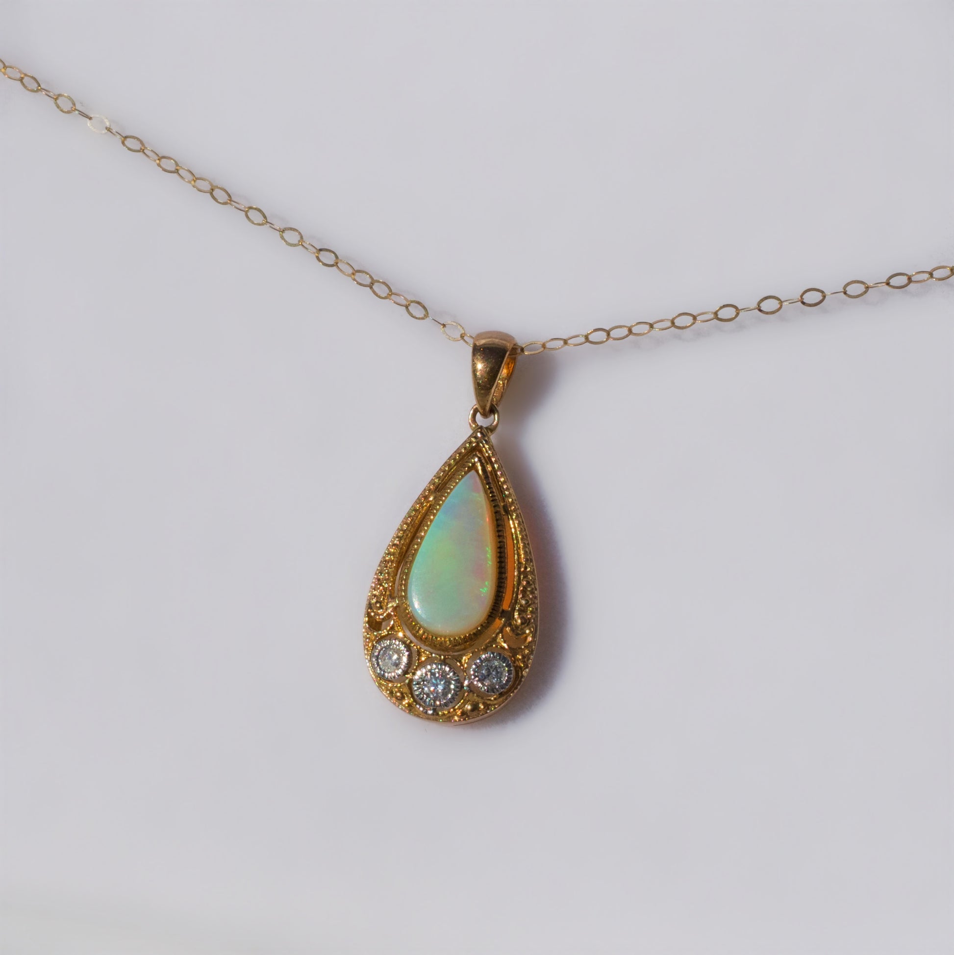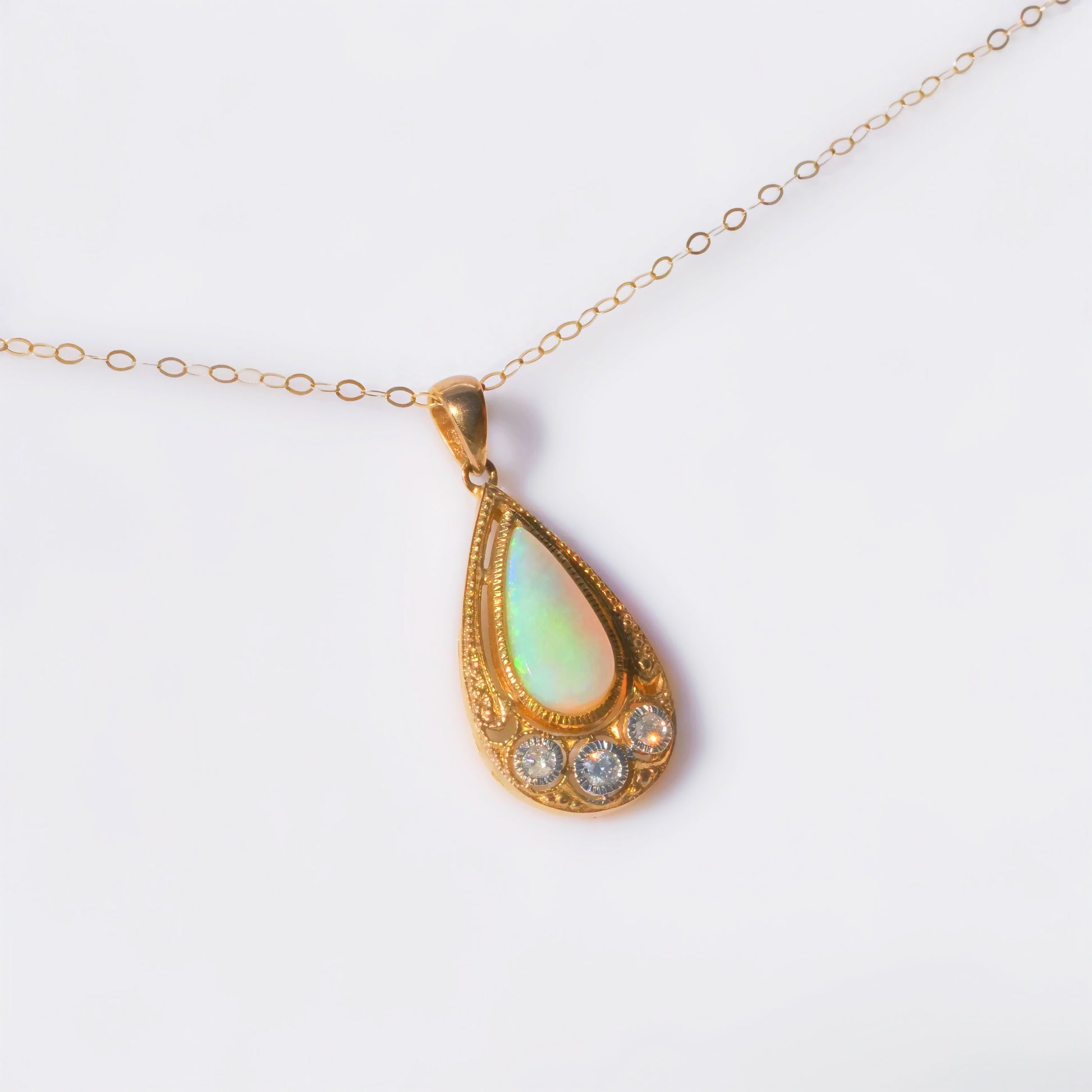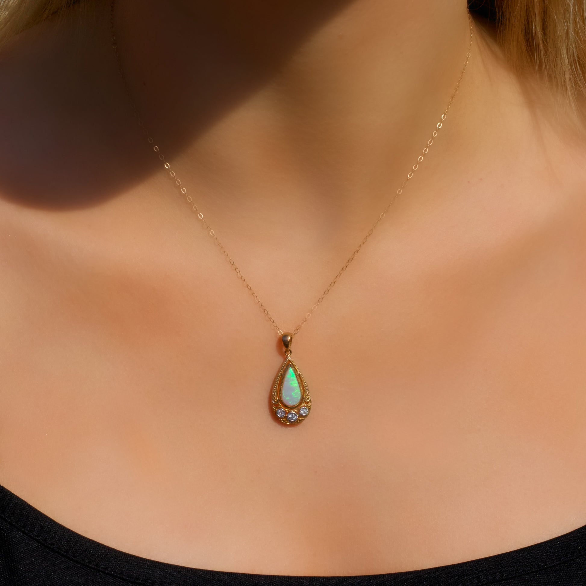 This mesmerising necklace features a pear cut, milky opal bezel set into the centre of the pendant.