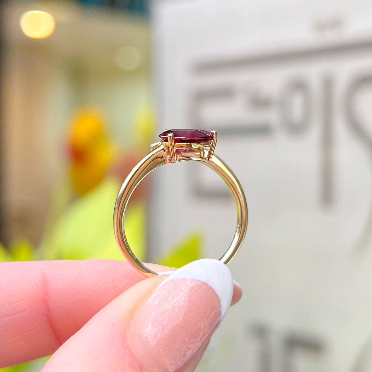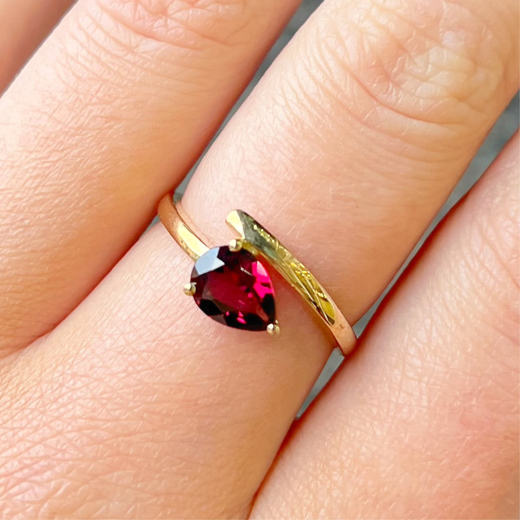 This stunning ring makes a perfect everyday piece or stacking ring! It features a raspberry-red, pear-shaped garnet claw set in a chunky, organic 9ct yellow gold design.