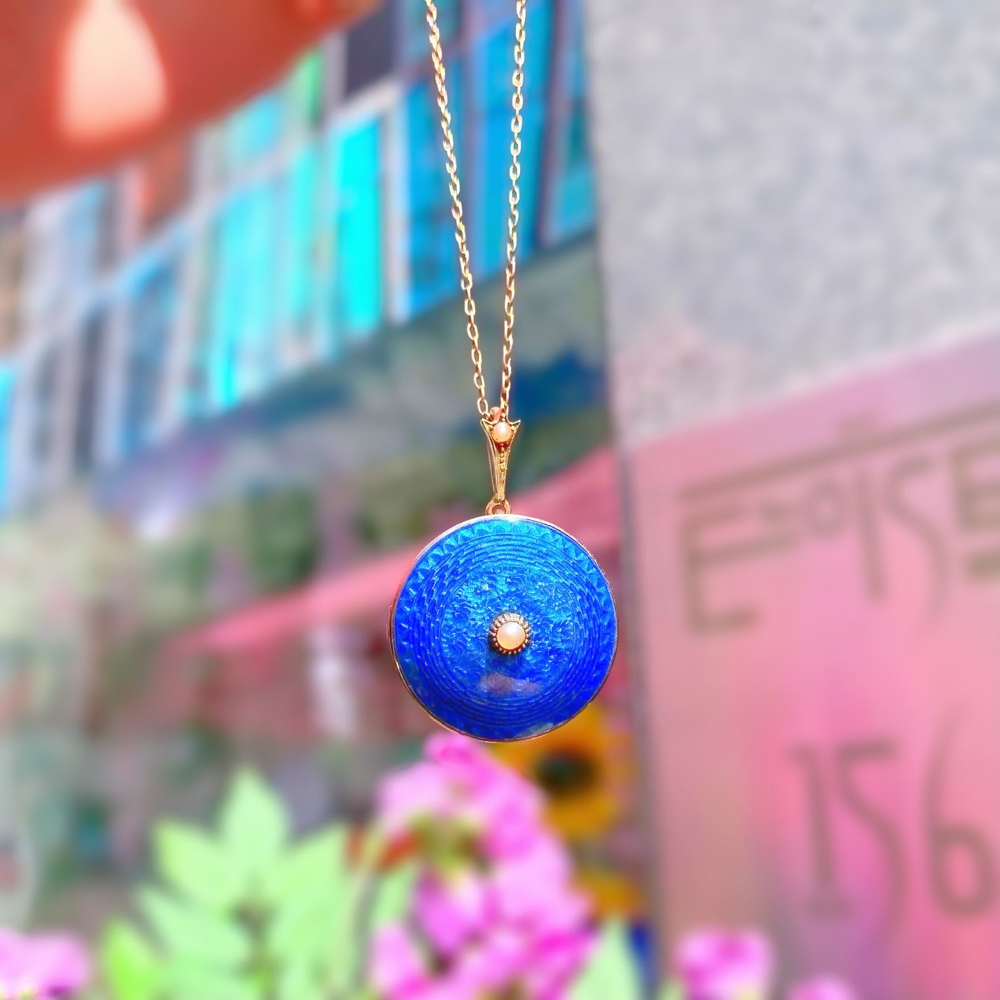 This elegant Edwardian necklace features a round display of regal blue guilloche enamel. Set in the centre of the bright blue target is a creamy, lustrous seed pearl, bezel-set into 9ct rose gold of the most delectable hue.
