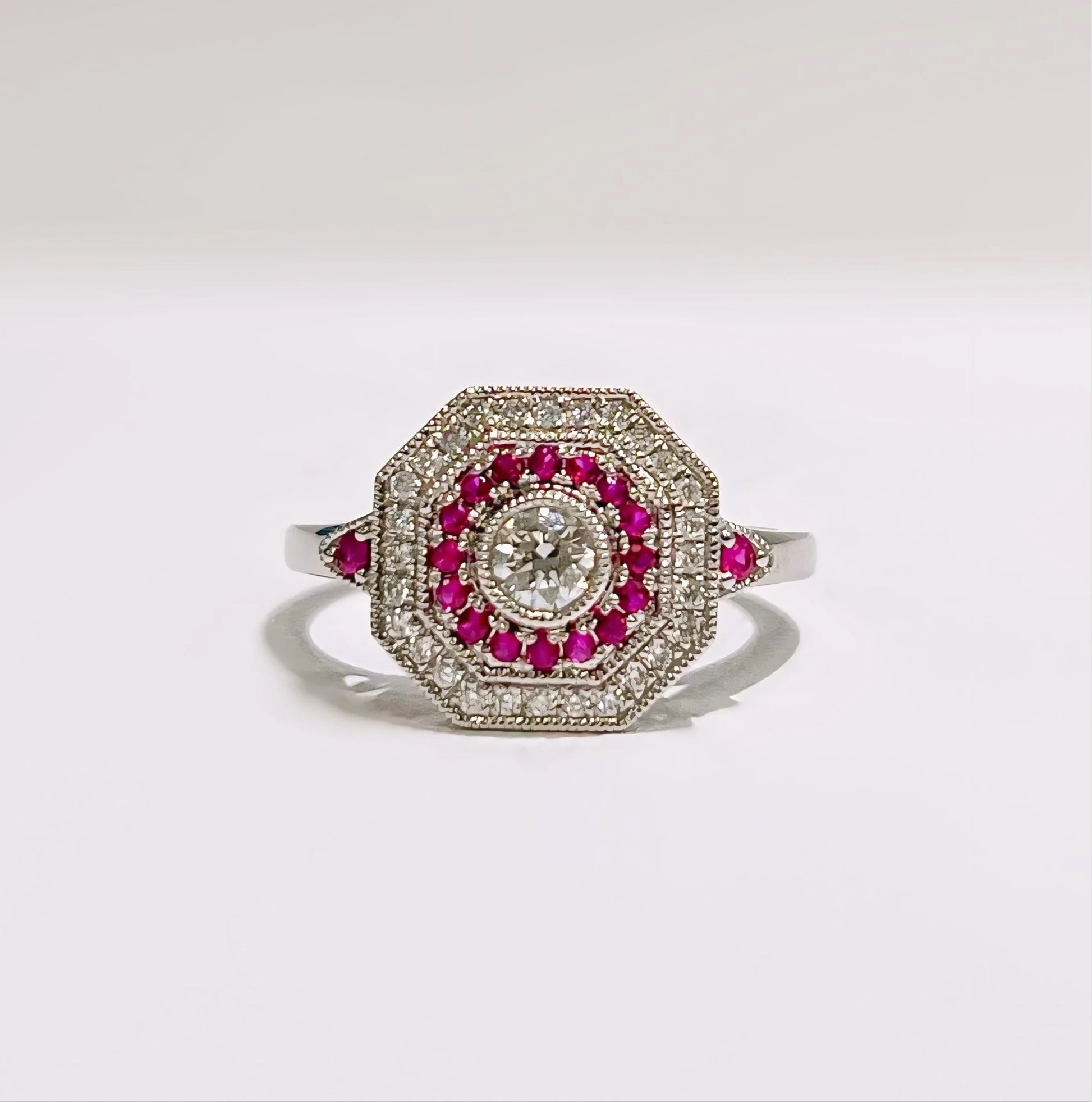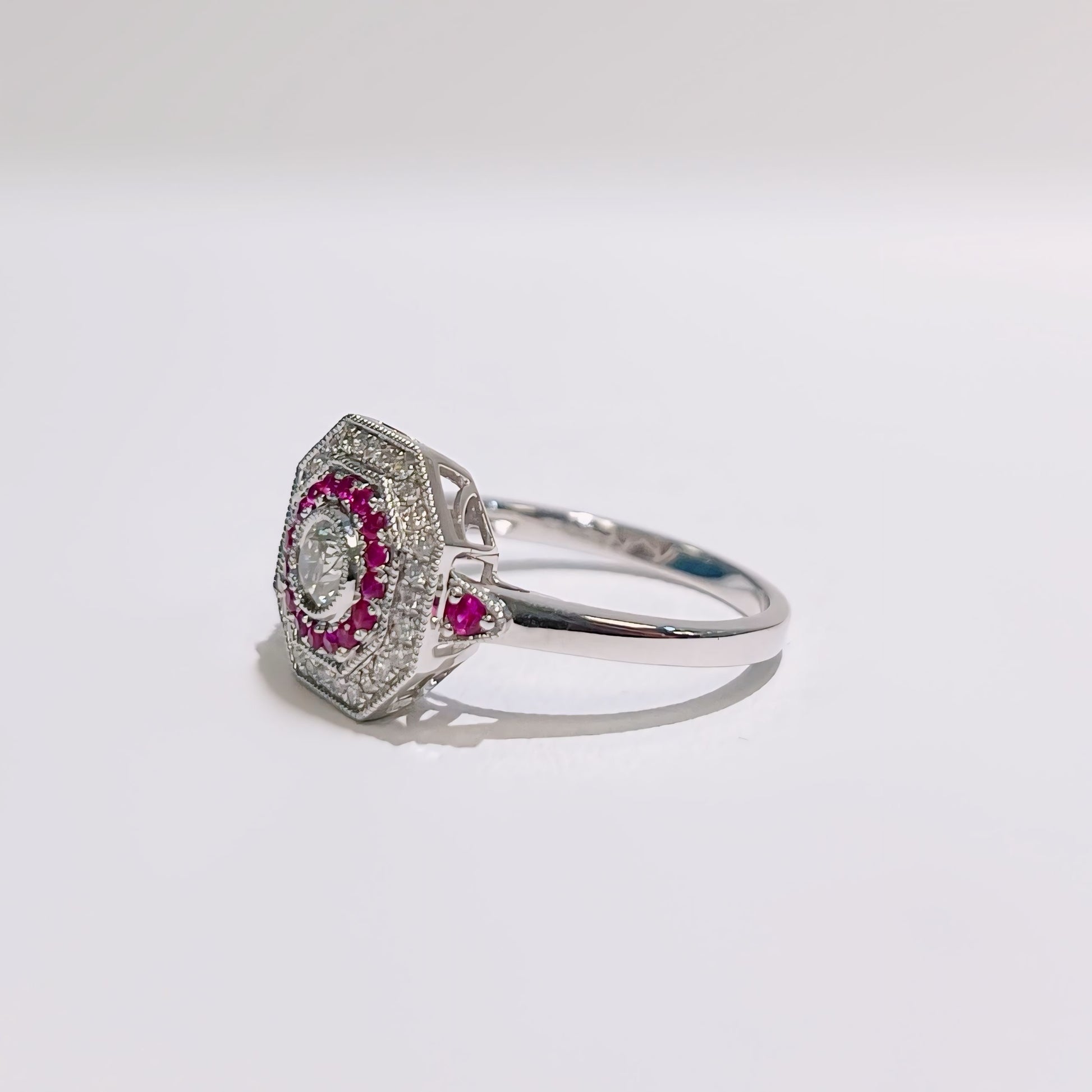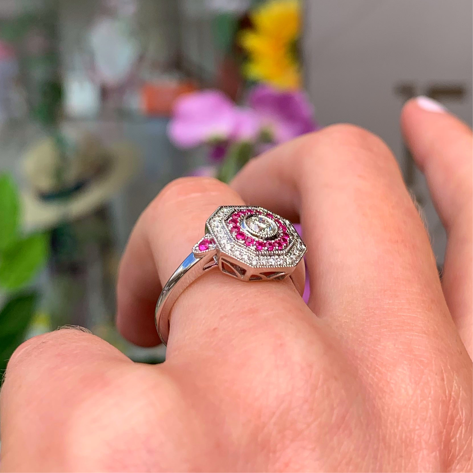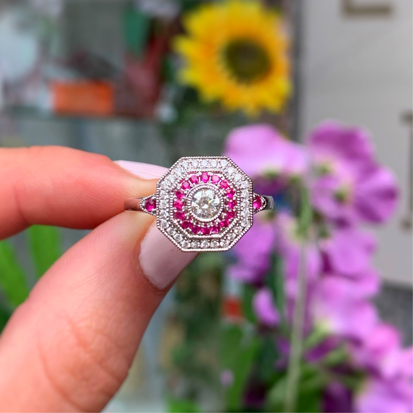 Crafted in the finest 18ct White Gold, this alluring beauty features a bright, crisp, brilliant-cut, round Diamond carefully bezel set into the centre of the design. Enveloping the central Diamond is a bright halo of dainty Rubies of a blushing pink hue. The outer surround of this ring glitters with 28 sparkling round cut Diamonds. To finish, this elegant beauty features a vibrant Ruby flanked on either side of the central design. The gallery of this masterpiece has been expertly pierced out in a geometric pattern native to the Art Deco period. This sweet ring would make the perfect engagement ring for those of you that love vintage style and a conversational piece of jewellery that is truly different to anything out there!