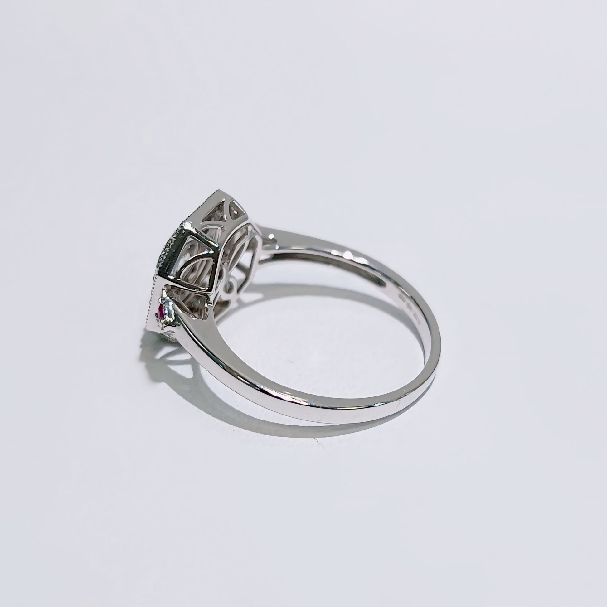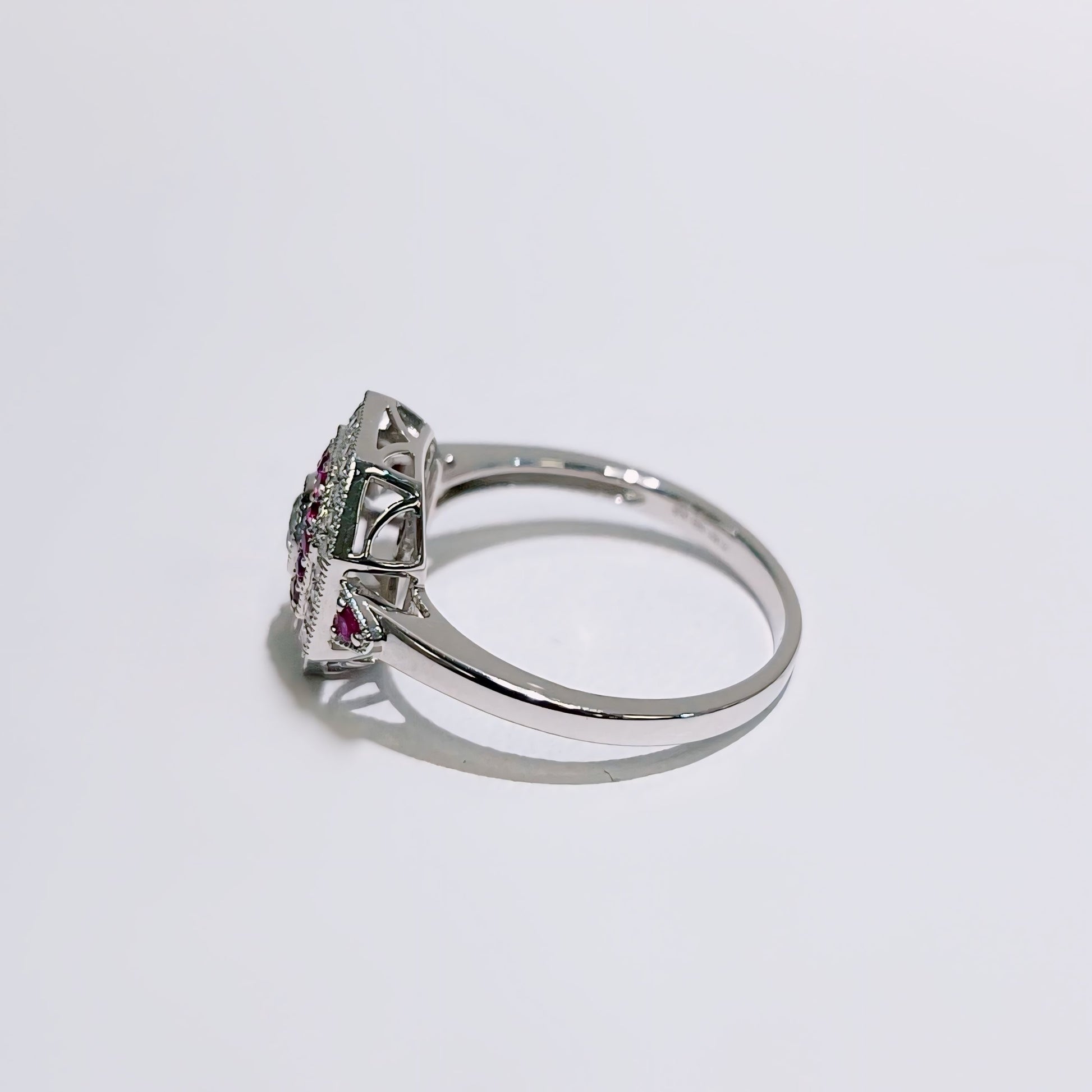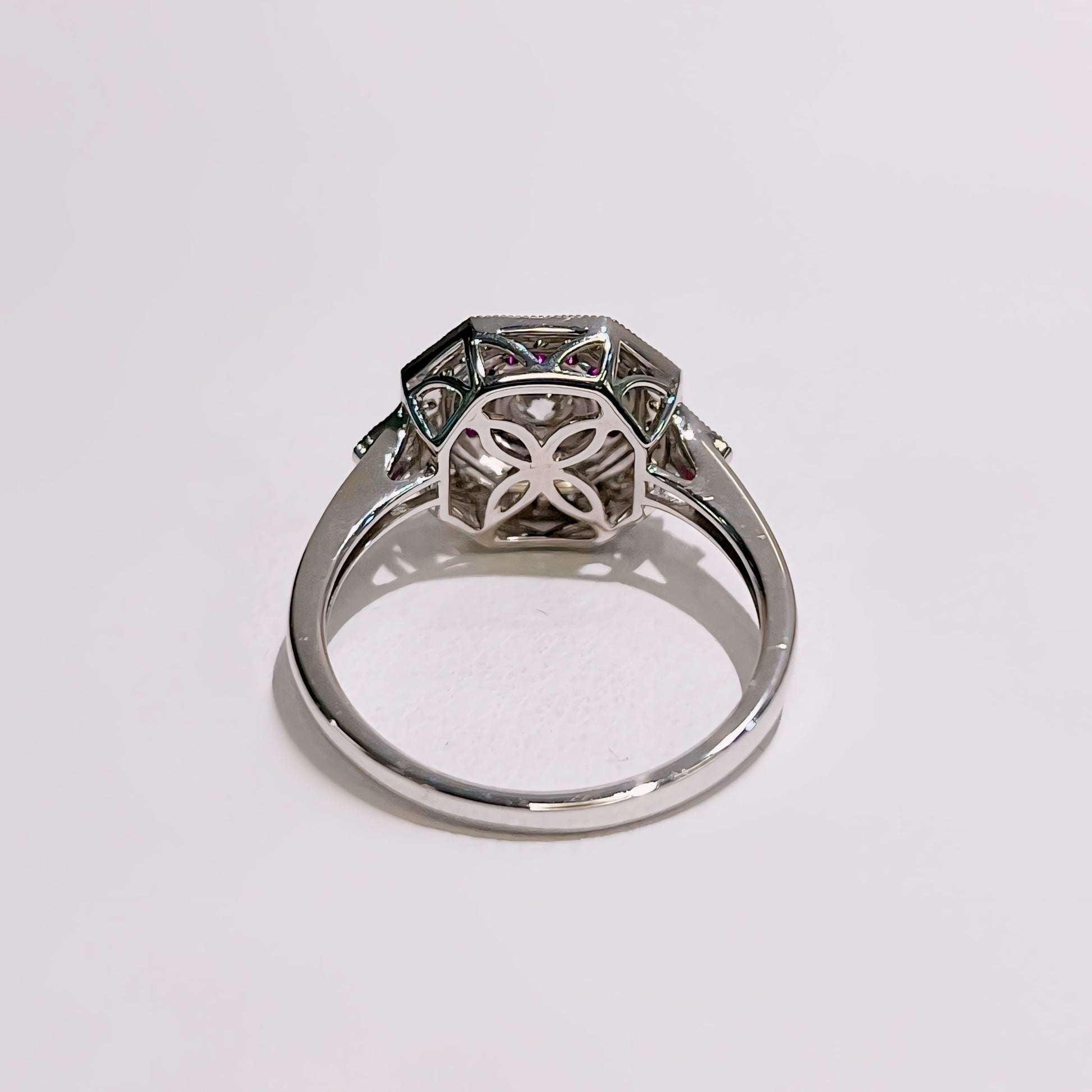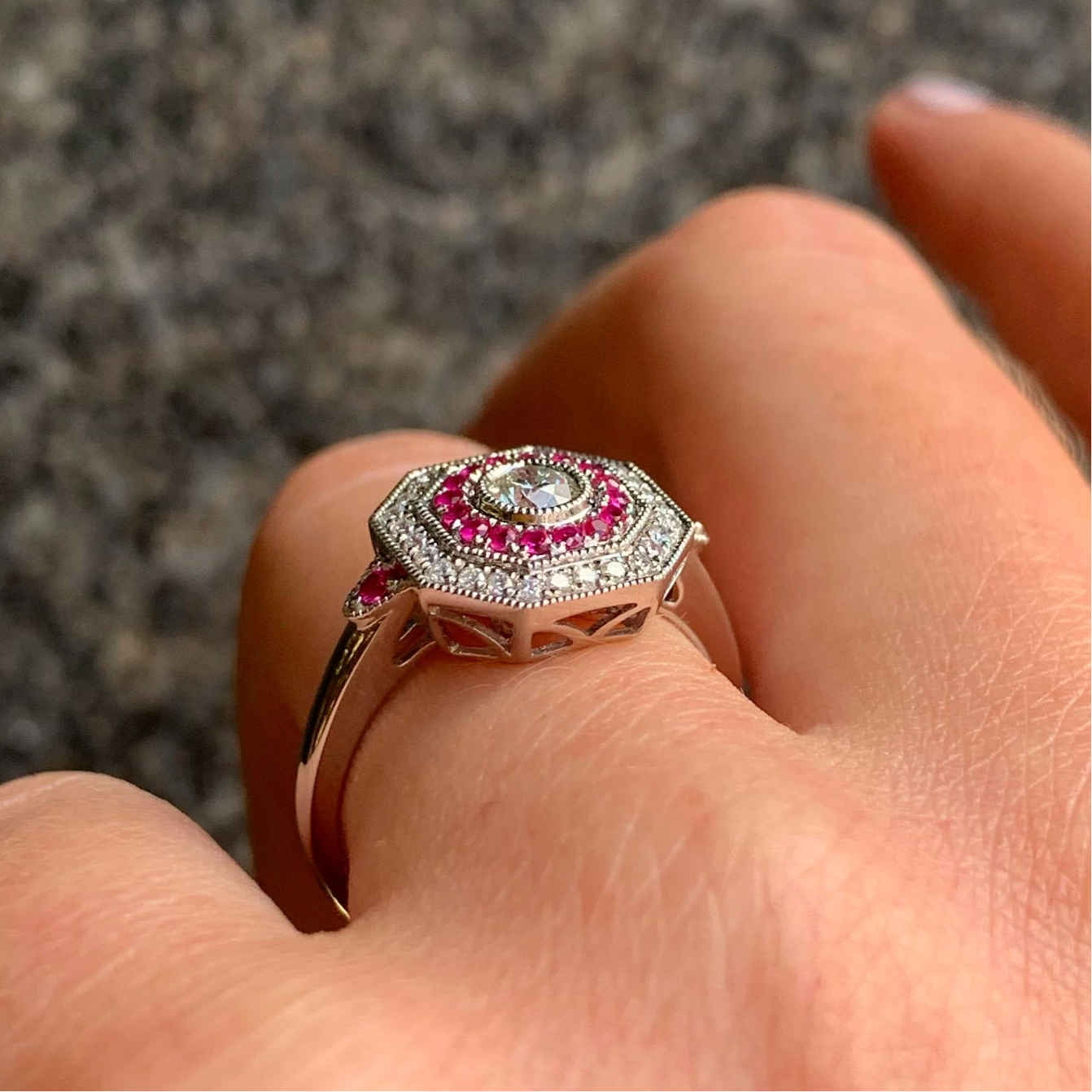 Crafted in the finest 18ct White Gold, this alluring beauty features a bright, crisp, brilliant-cut, round Diamond carefully bezel set into the centre of the design. Enveloping the central Diamond is a bright halo of dainty Rubies of a blushing pink hue. The outer surround of this ring glitters with 28 sparkling round cut Diamonds. To finish, this elegant beauty features a vibrant Ruby flanked on either side of the central design. The gallery of this masterpiece has been expertly pierced out in a geometric pattern native to the Art Deco period. This sweet ring would make the perfect engagement ring for those of you that love vintage style and a conversational piece of jewellery that is truly different to anything out there!