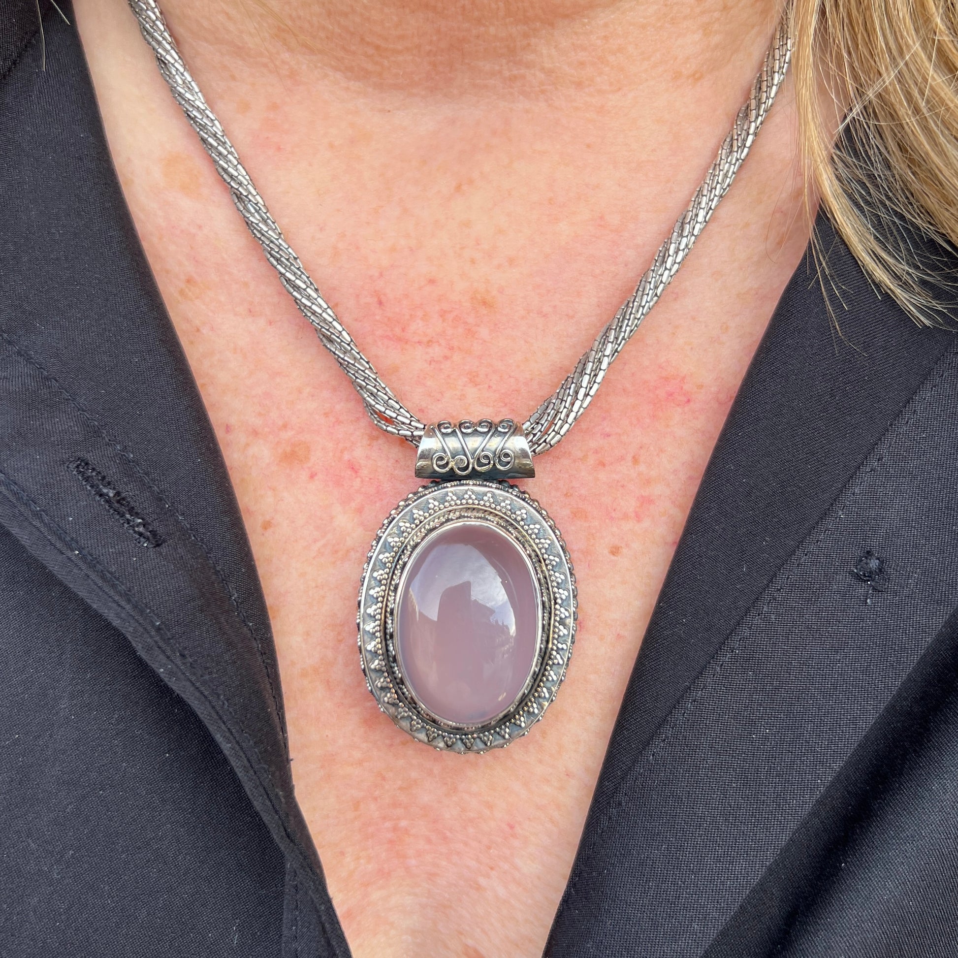 This beautiful pendant features a pale pink rose quartz stone bezel set in sterling silver.