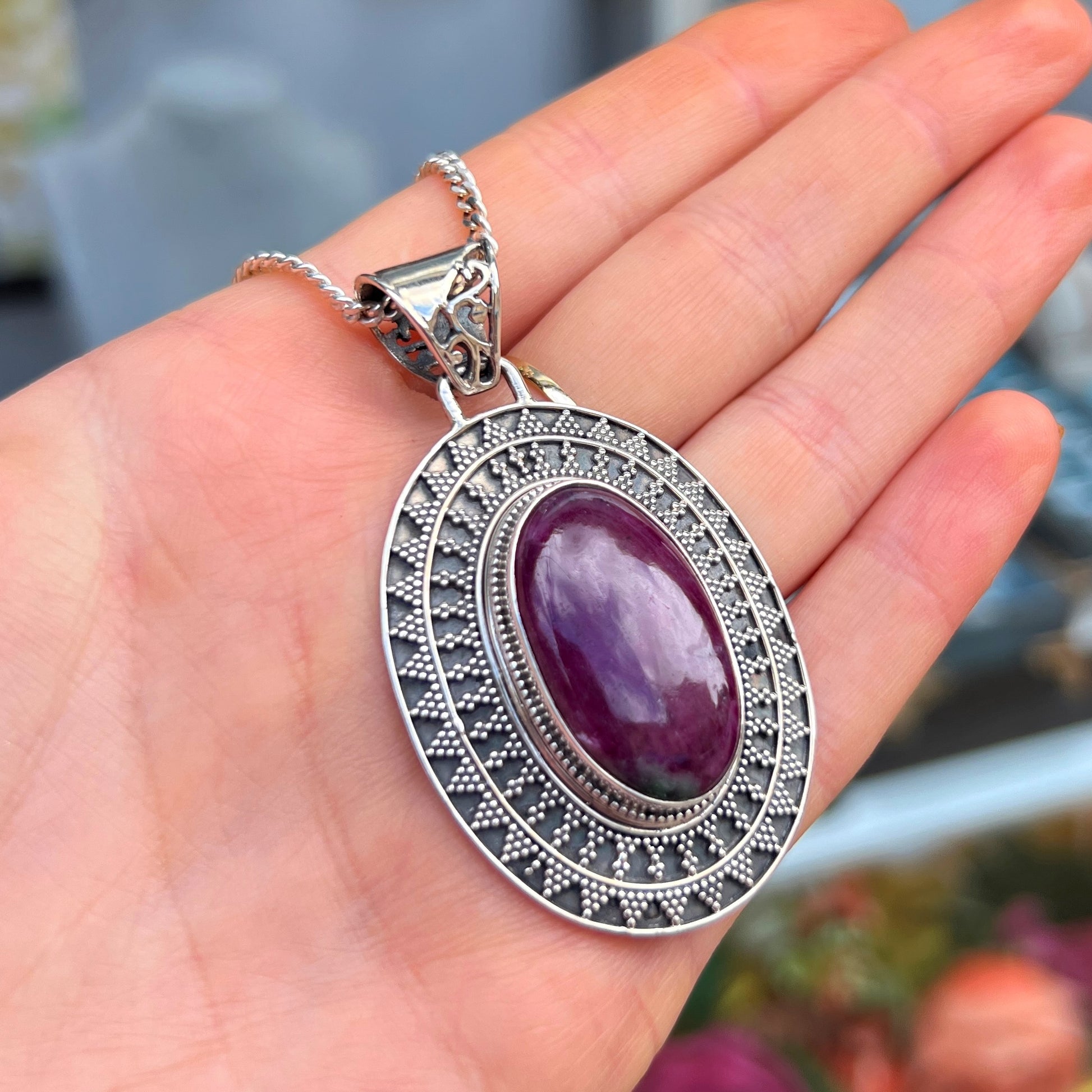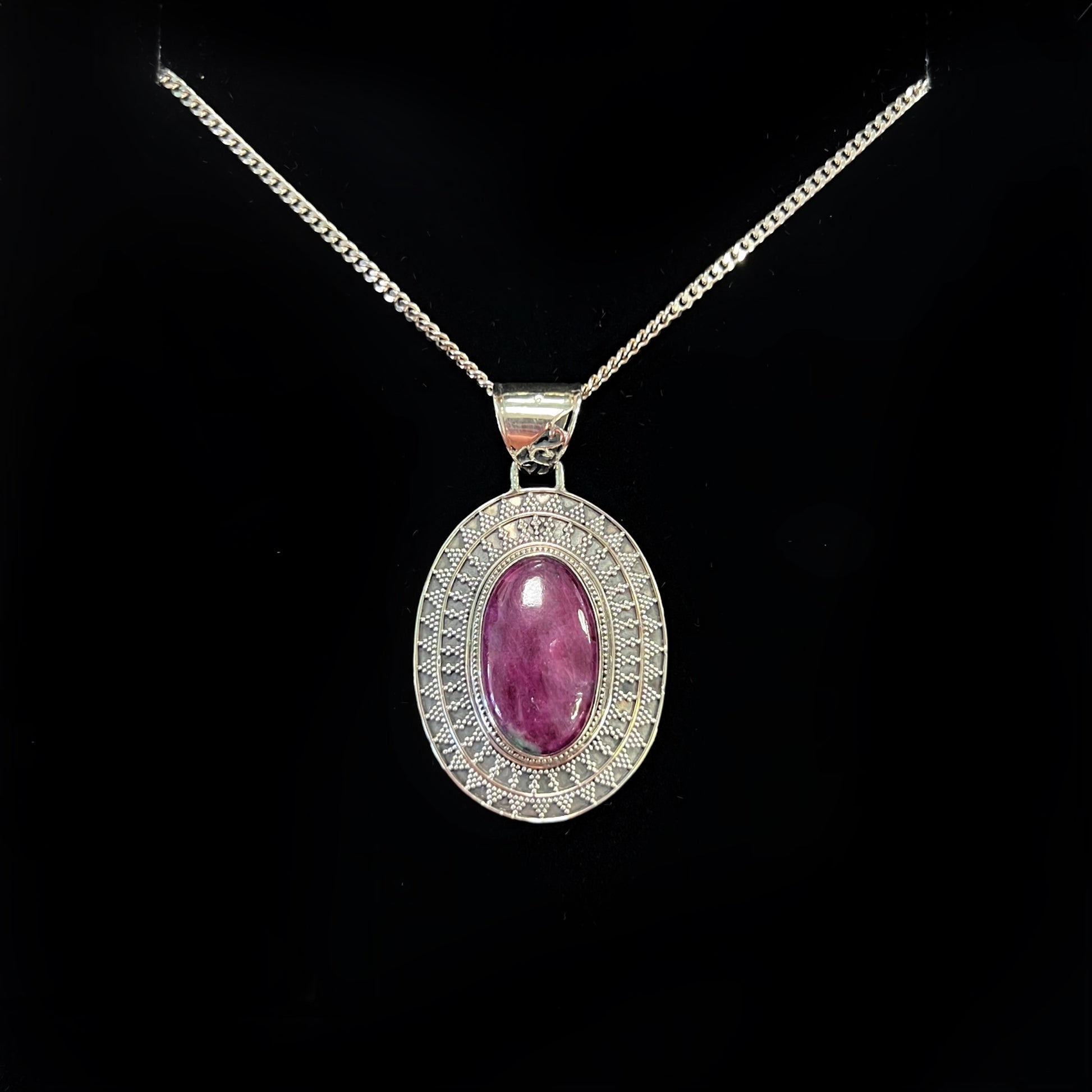 This ornate XL chunky pendant features one oval cut faceted ruby claw bezel in sterling silver.