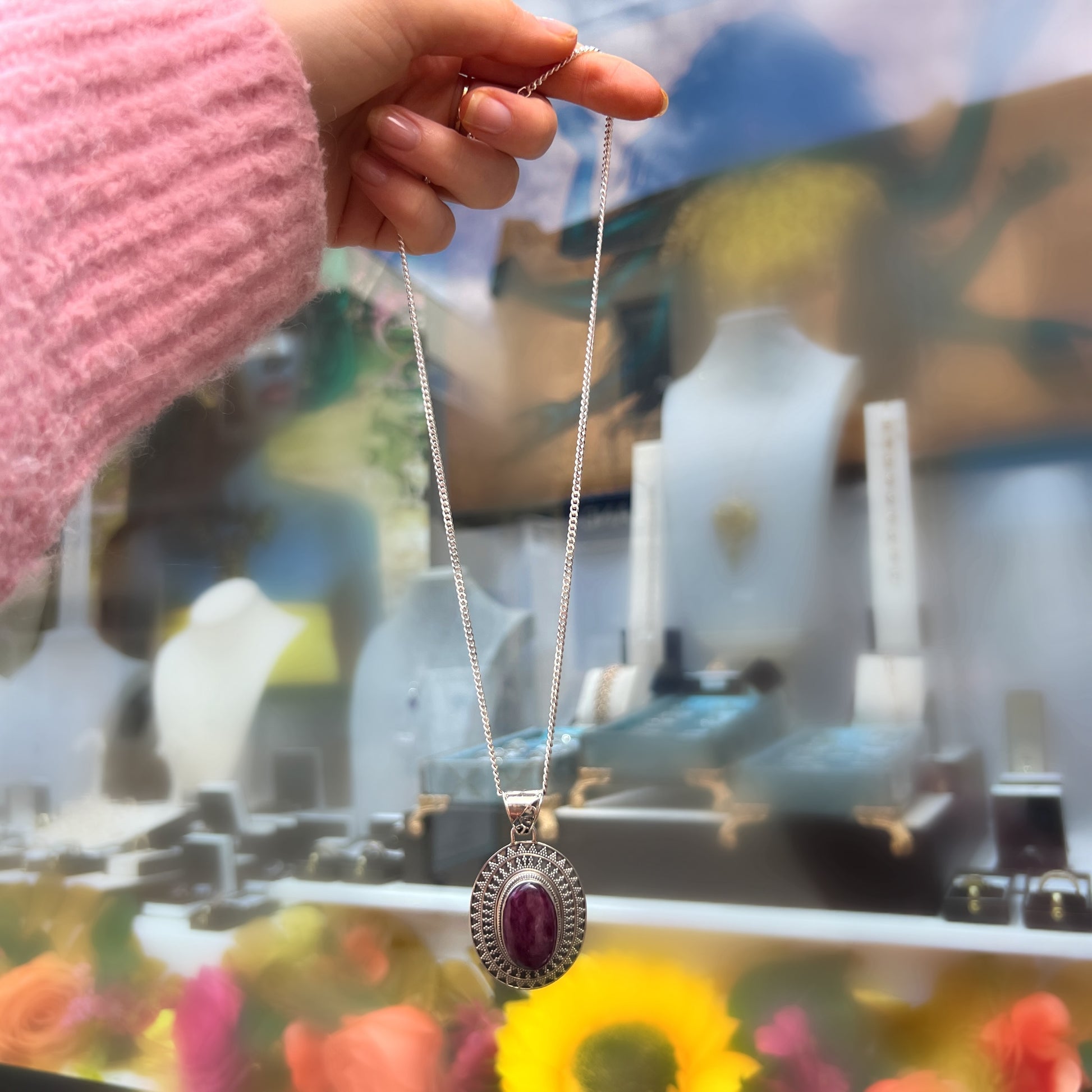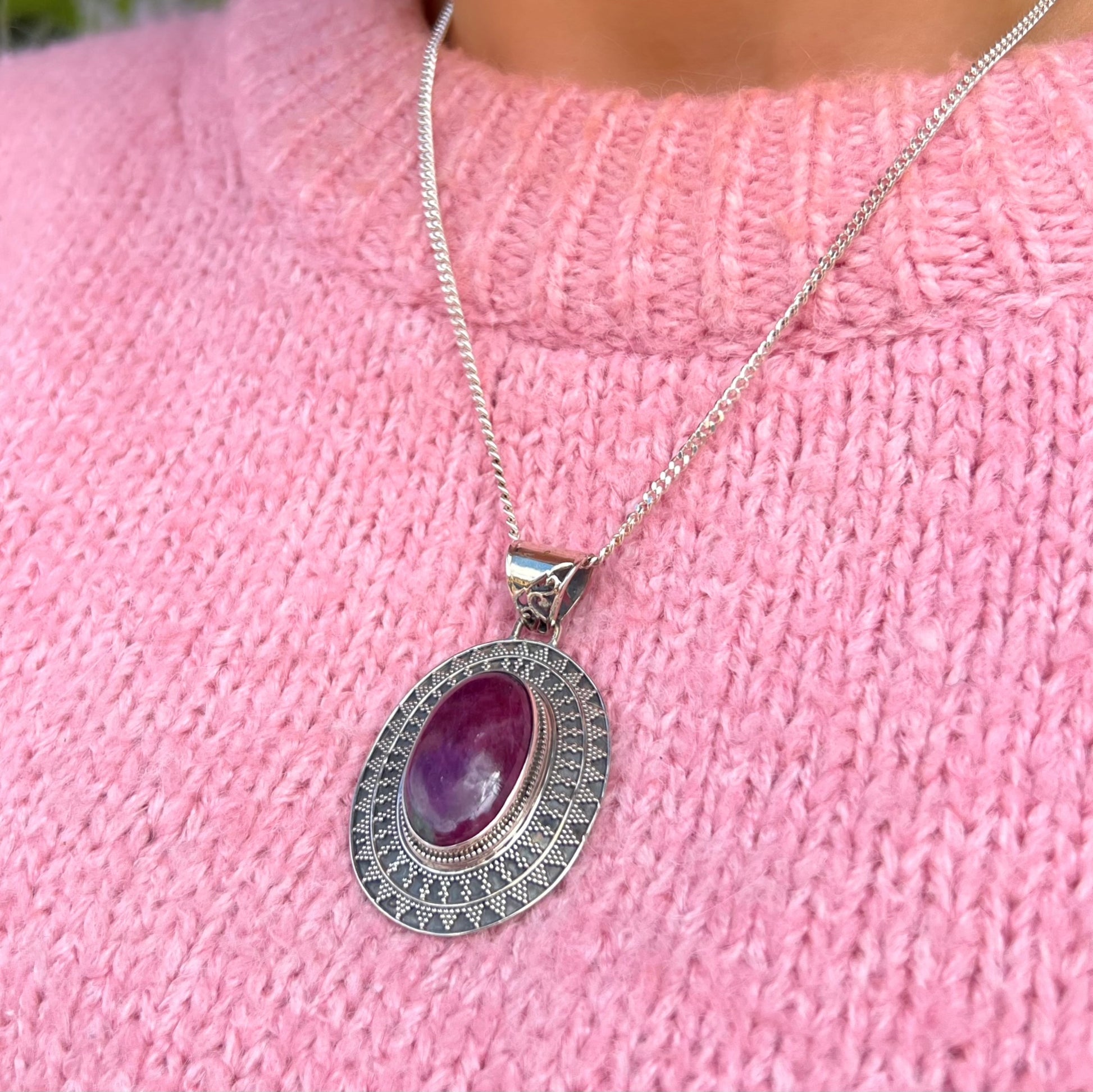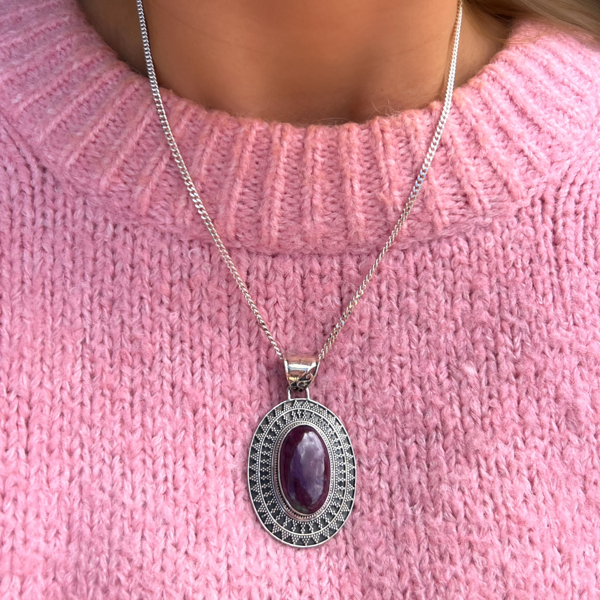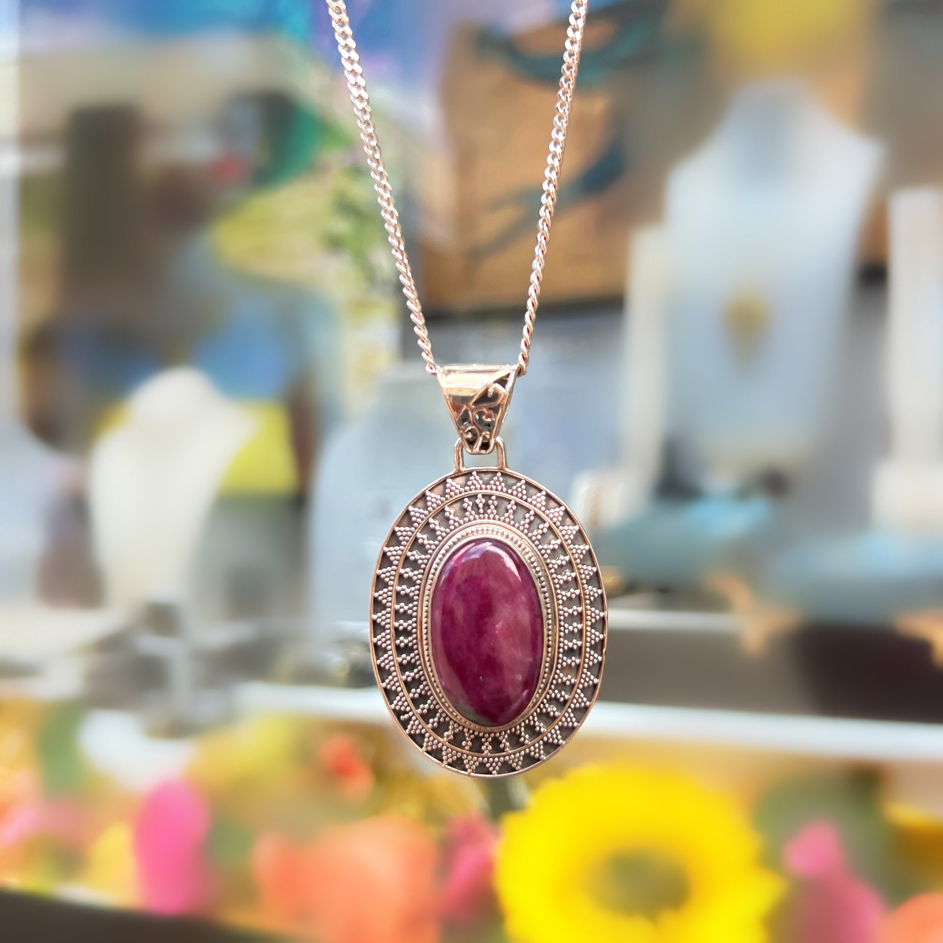 Bohemian Chunky Sterling Silver Red Ruby Pendant & Chain