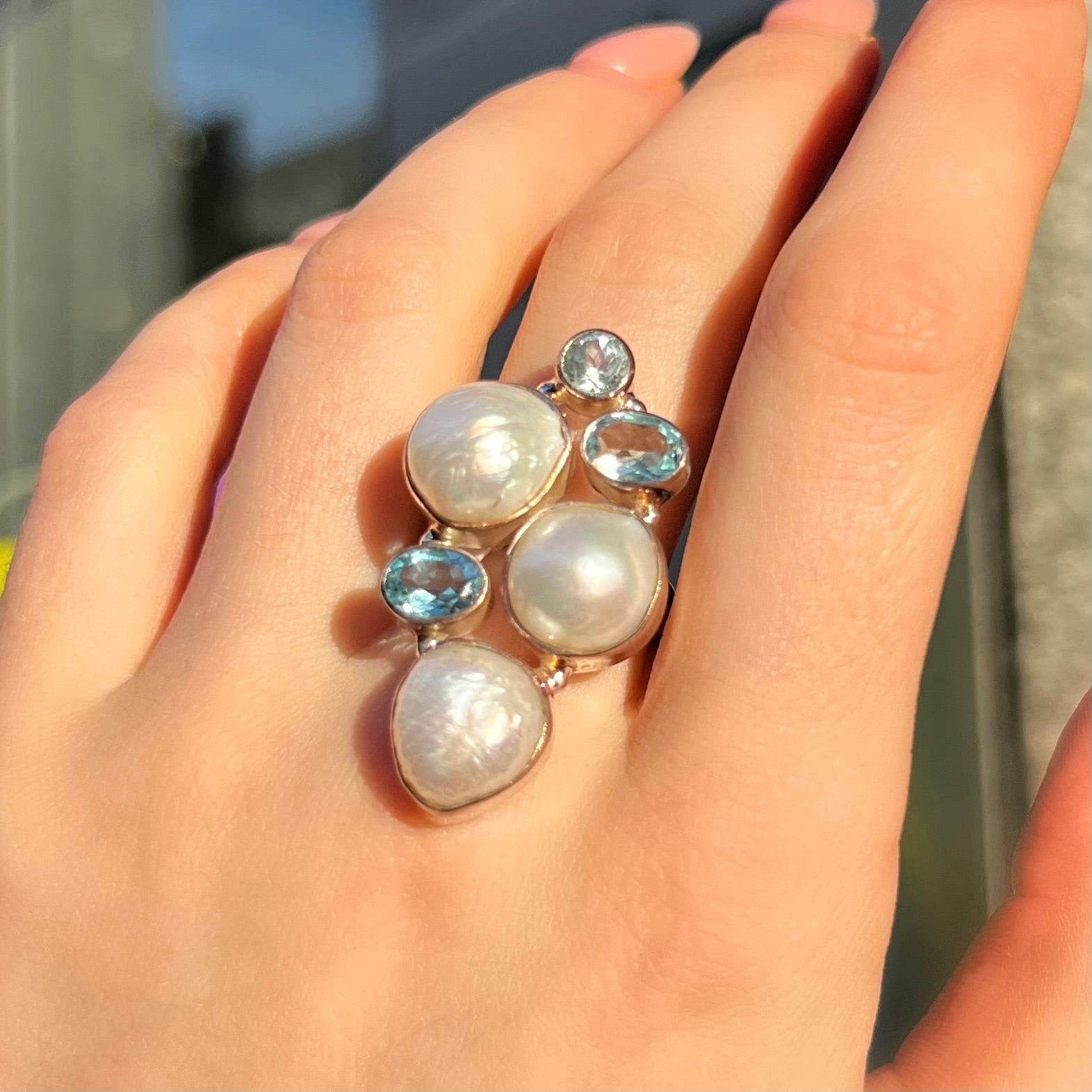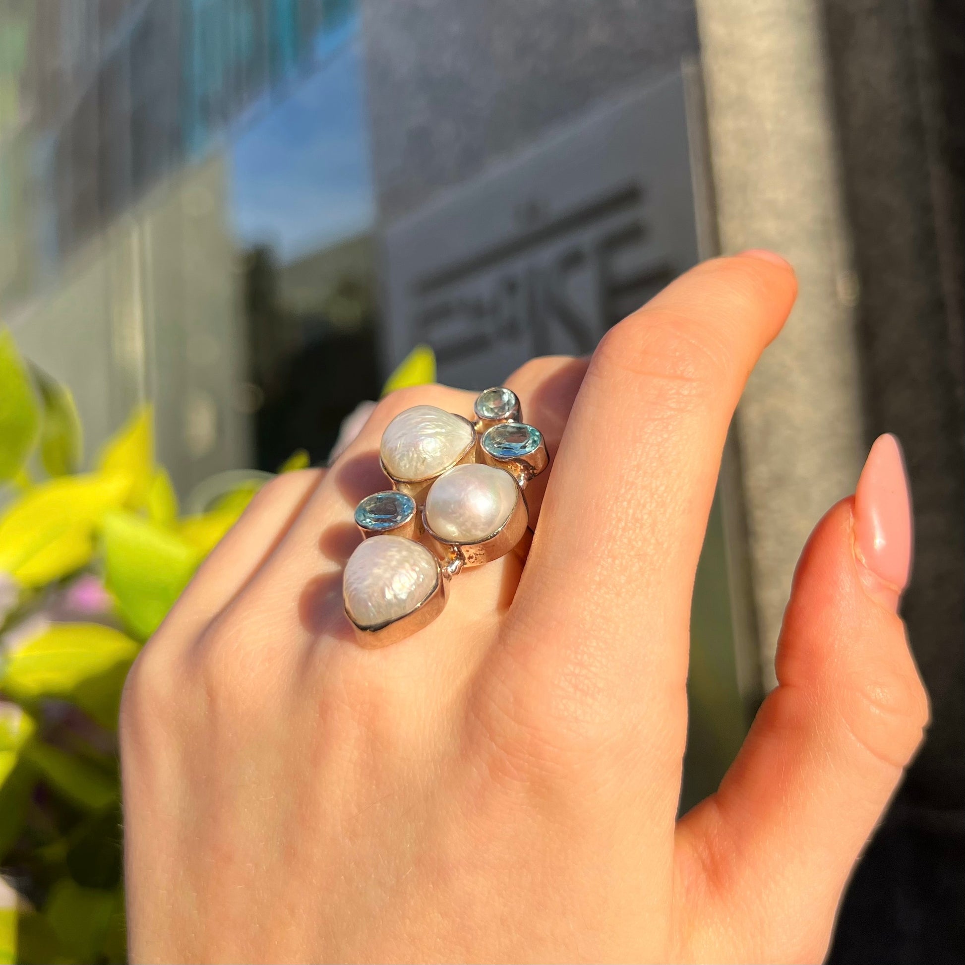 A unique statement ring featuring three large white baroque pearls alongside two oval cut and one round cut blue topaz. All bezel set.