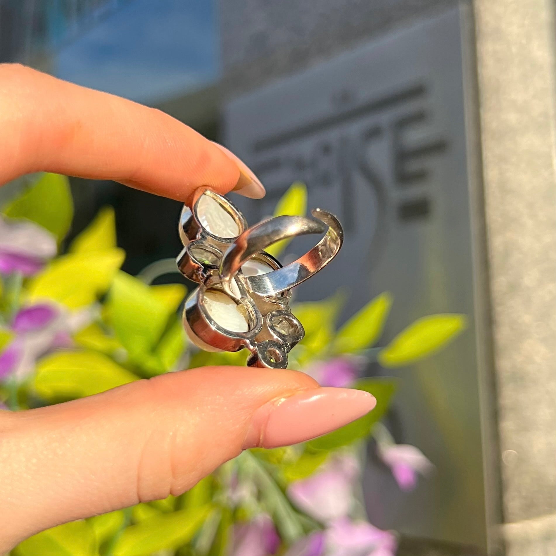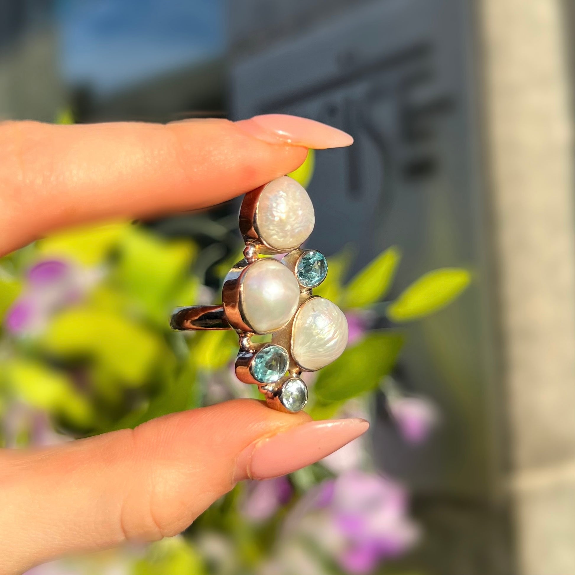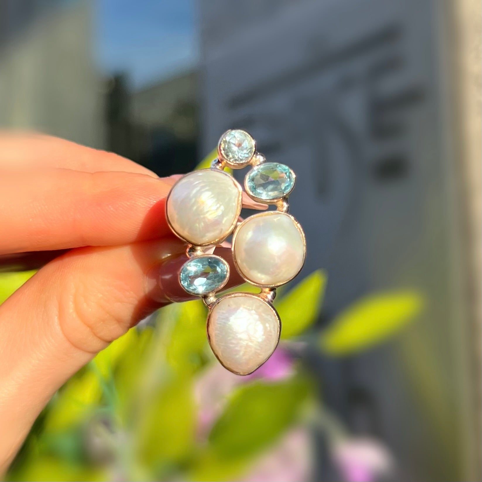 Sterling Silver Baroque White Pearl & Blue Topaz Unique Statement Ring - Adjustable Size