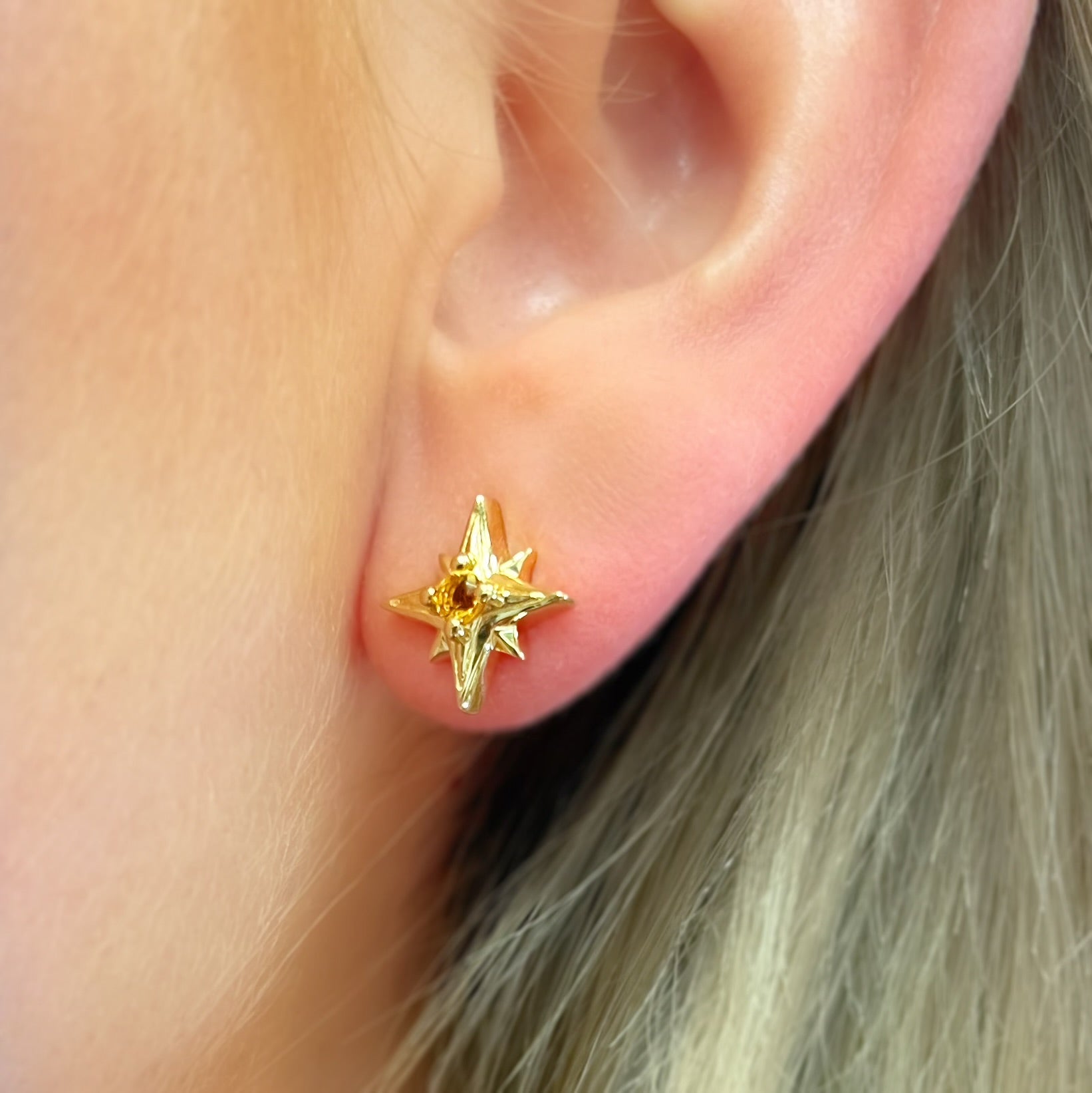 These glorious golden stud earrings are perfect for everyday wear. Made in sterling silver with a gold-plated finish, they feature deep golden yellow citrines expertly claw-set at the heart of a beautiful, pointed celestial star design.