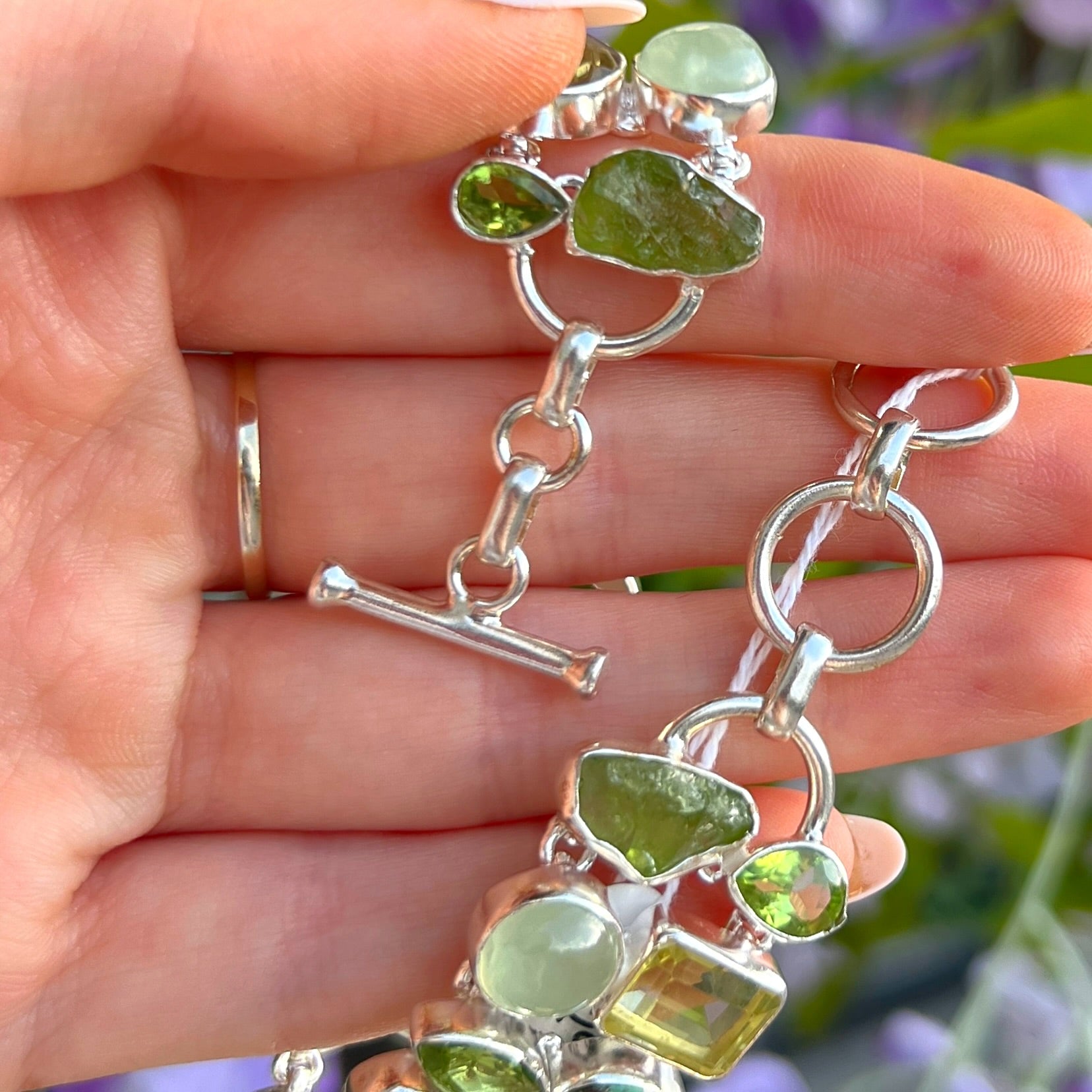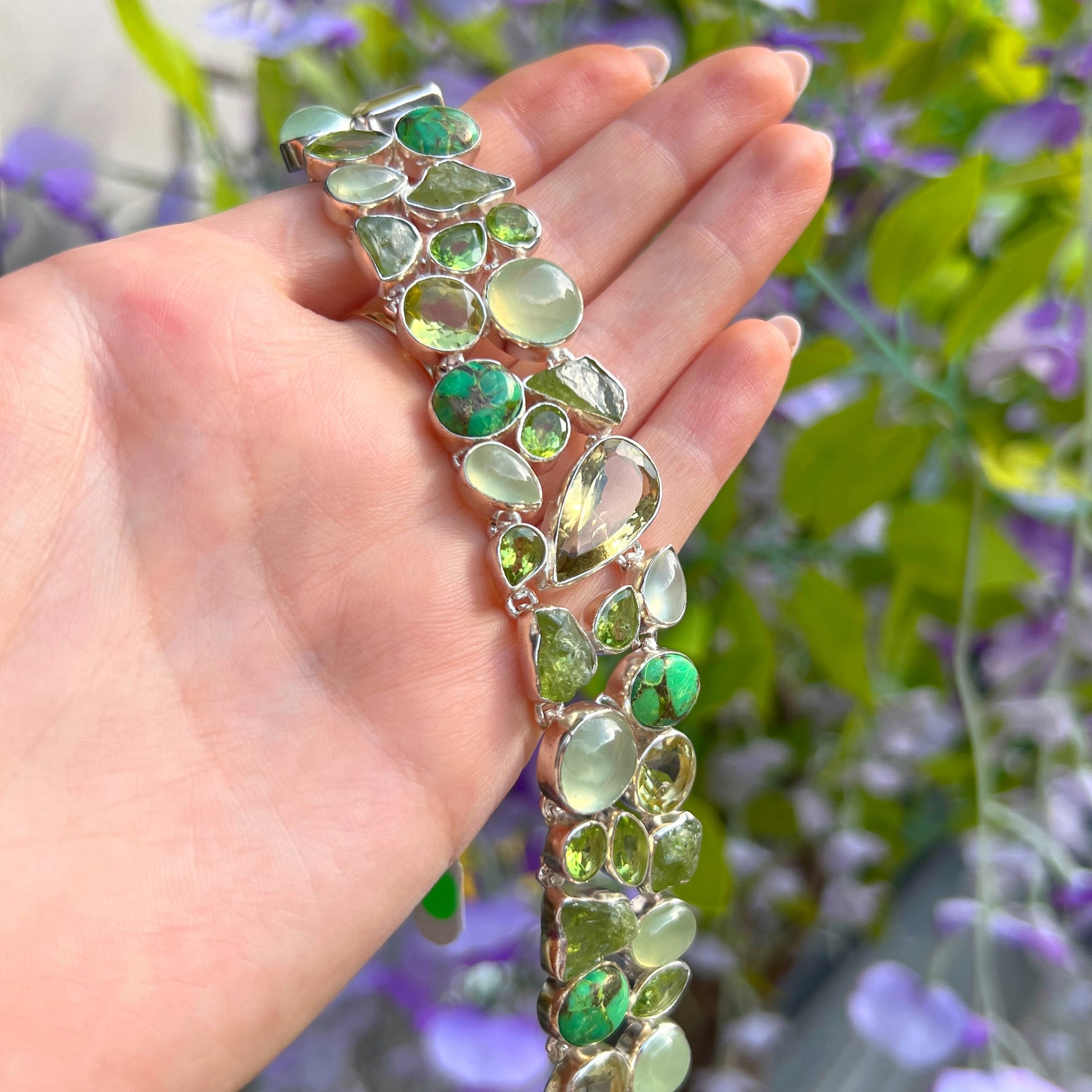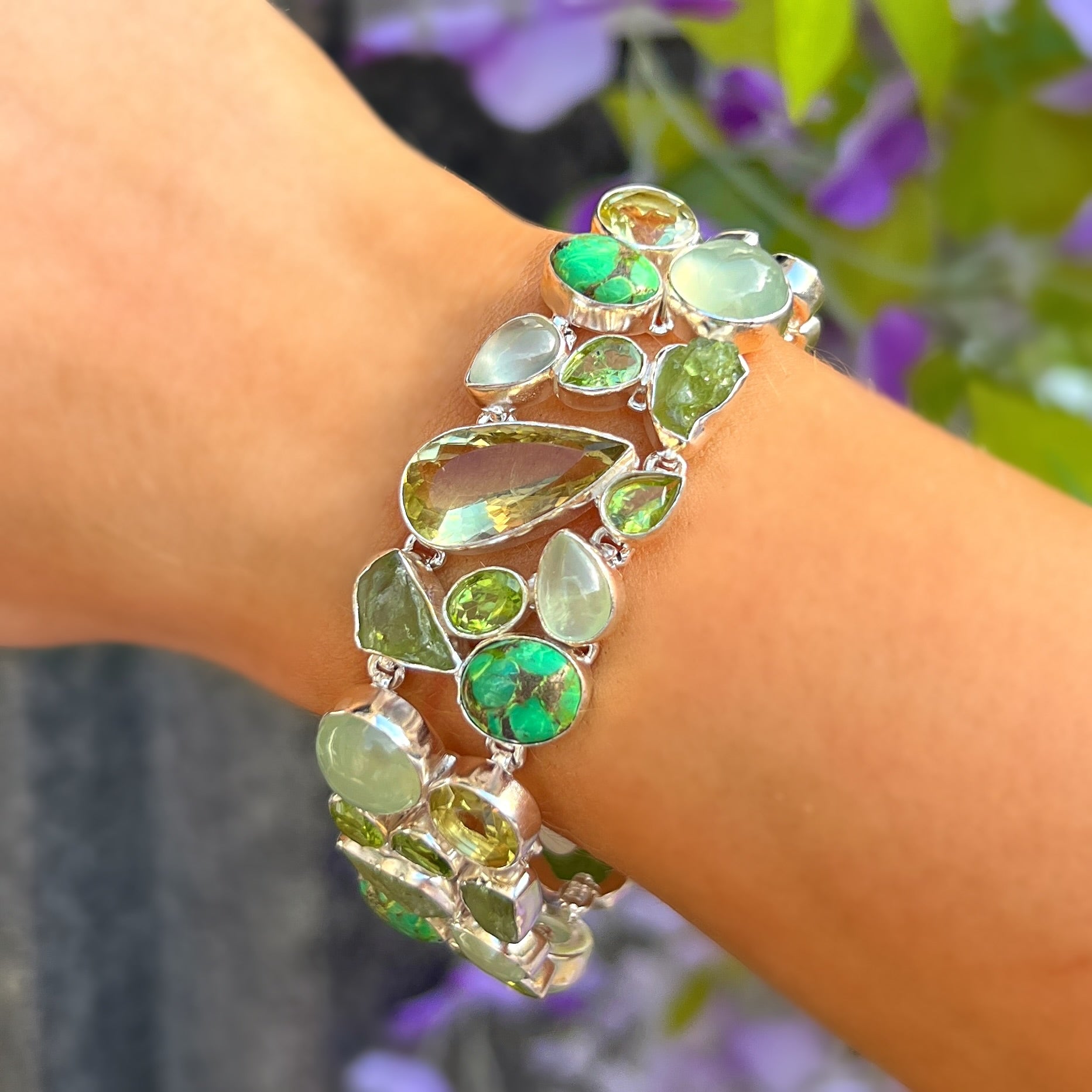 Chunky Bohemian Green Amethyst, Kyanite, Prehnite, Peridot, Turquoise & Lemon Topaz Sterling Silver Bracelet