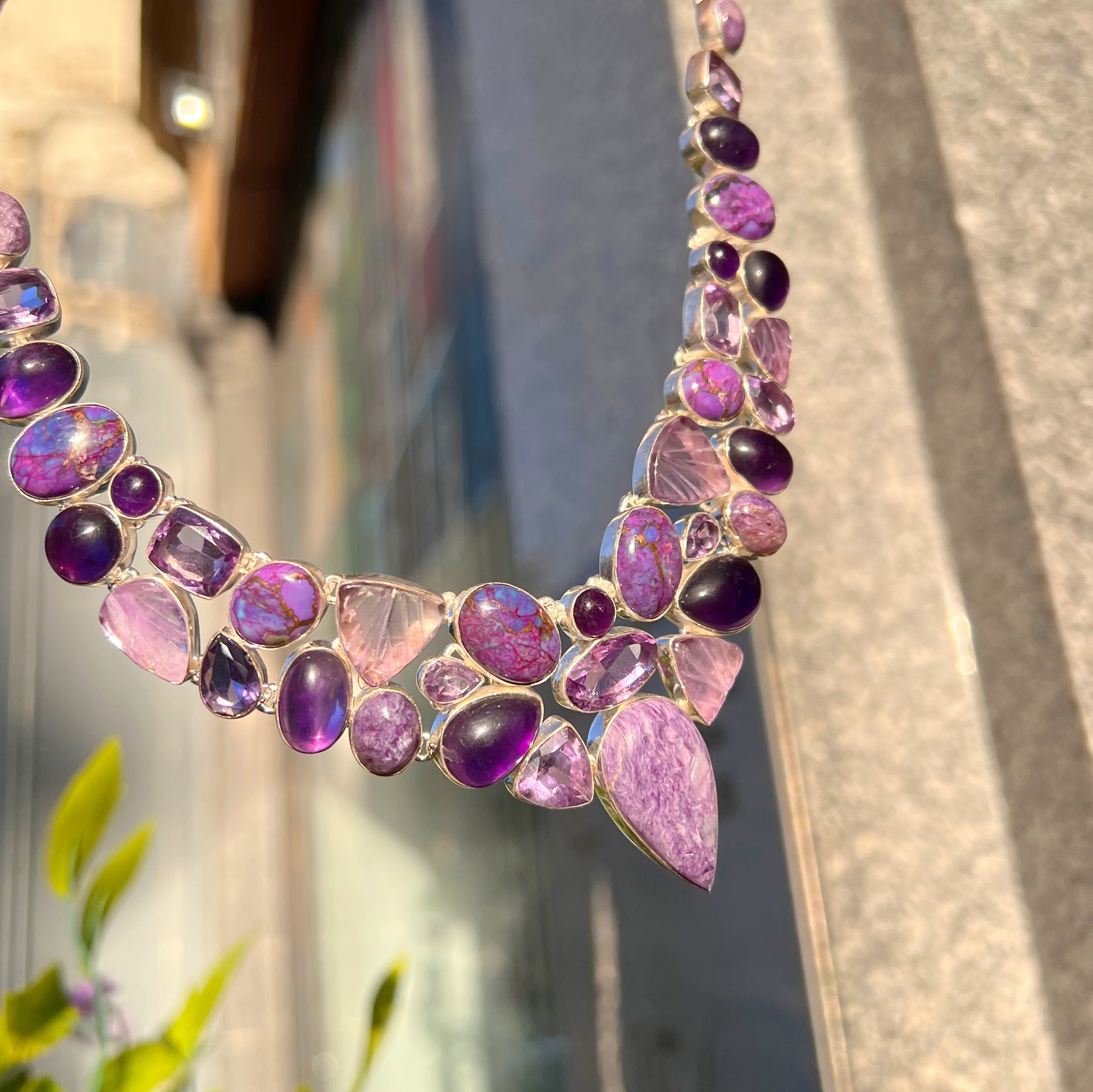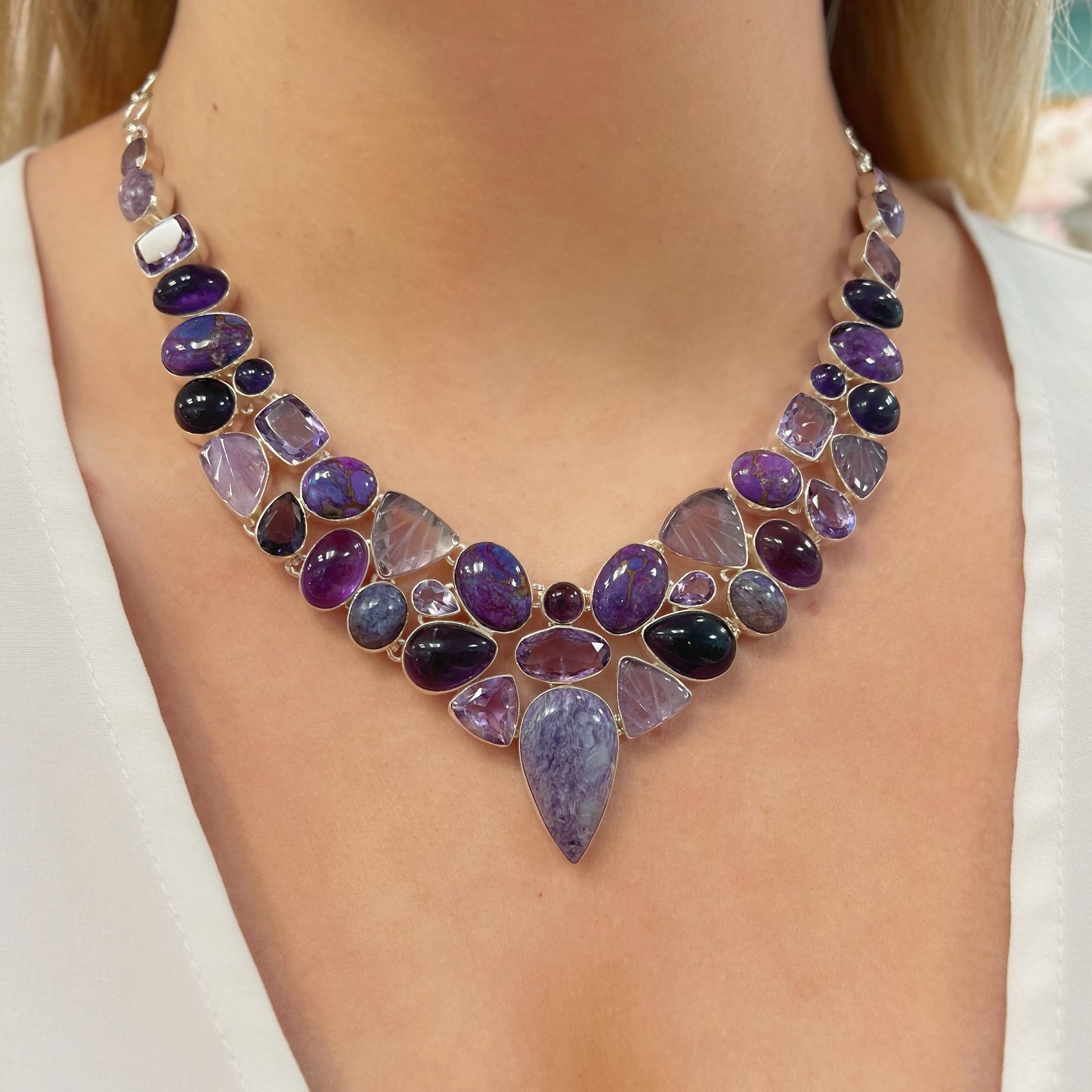 It showcases beautiful amethyst in three different forms - classic cabochon, faceted, and carved - alongside unique Mohave turquoise and the spiritual charoite, which unify the rich purple hues of the piece.